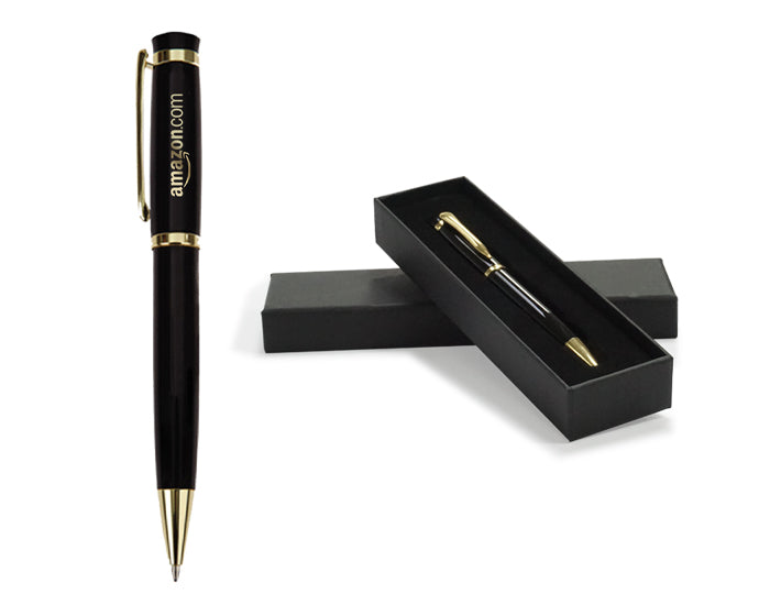 bolígrafo metálico con detalles en tono dorado. destape para grabado láser en color cobre. mecanismo retráctil. presentación: caja en color negro.