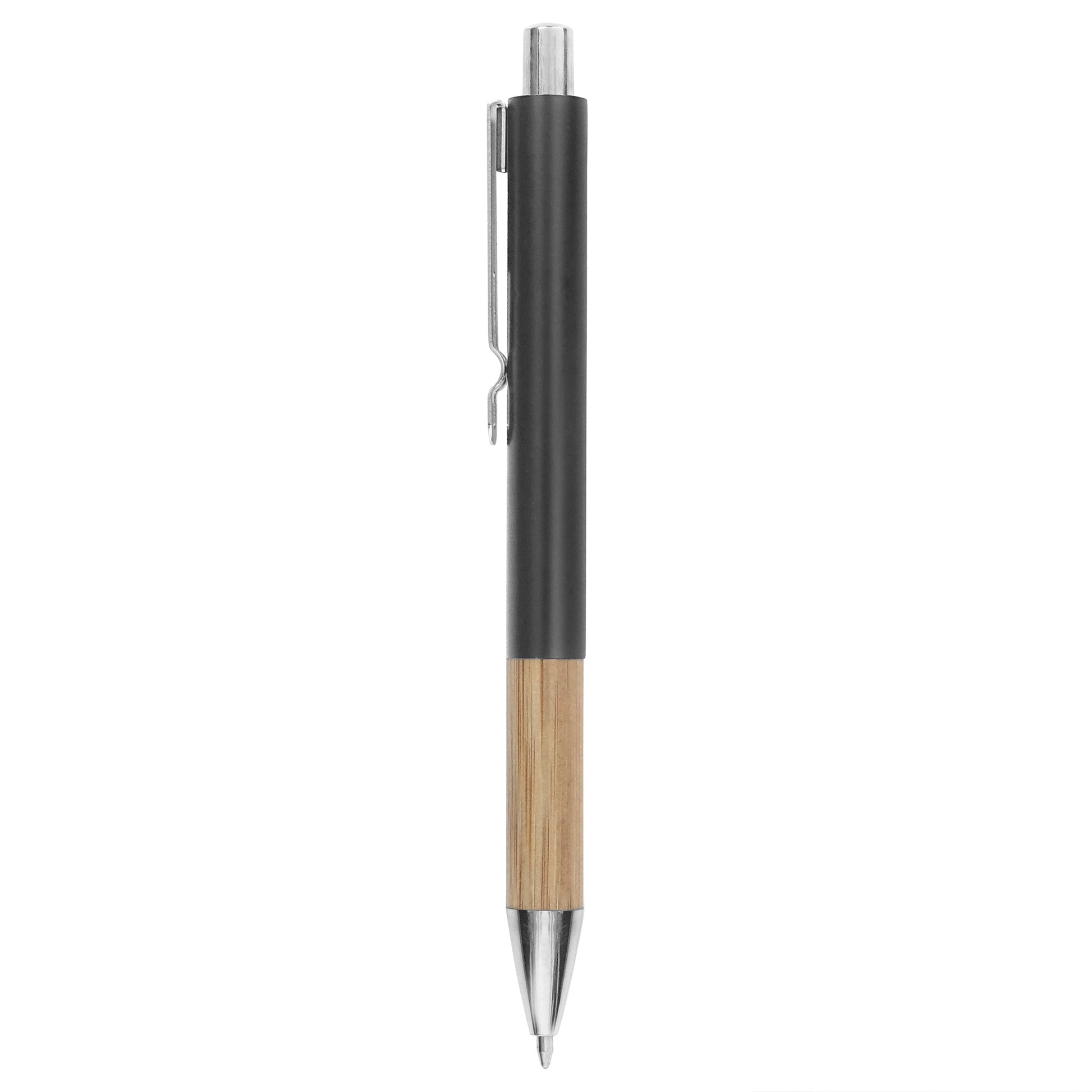 metal. cuerpo de aluminio en diferentes colores. grip de bambú. clip metálico. pulsador y puntera plásticas color plata. tinta negra. destape color plata.
