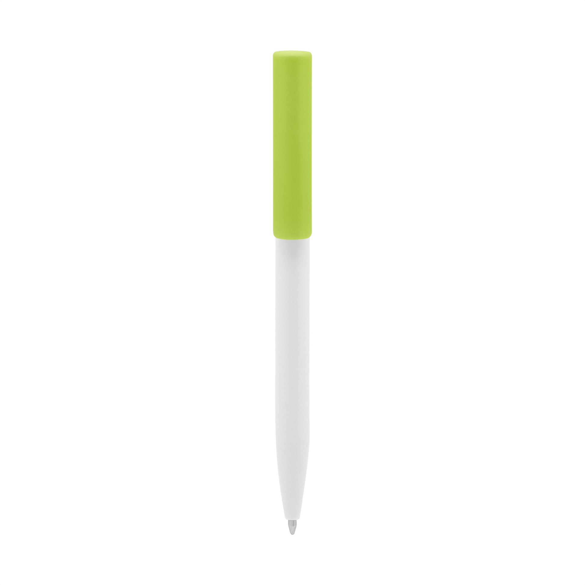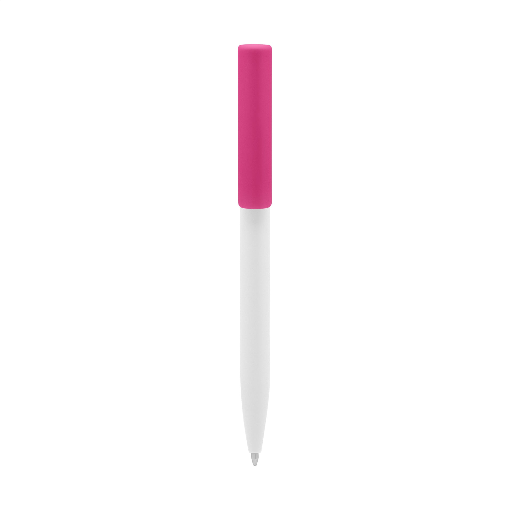 plástico. cuerpo blanco y clip de diferentes colores. bolígrafo retráctil. clip plástico de colores. tinta negra. sistema de botón push para destapar. amplia área de impresión.