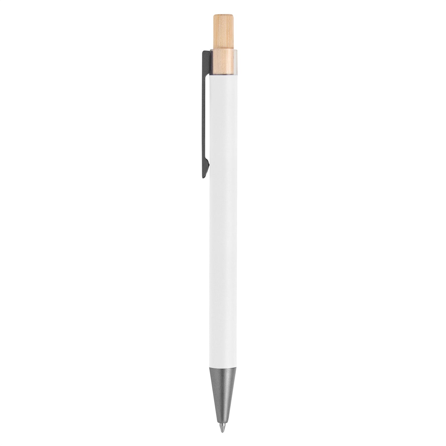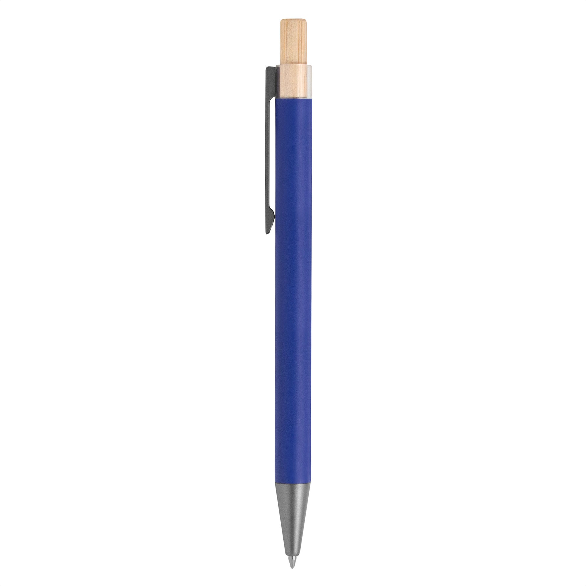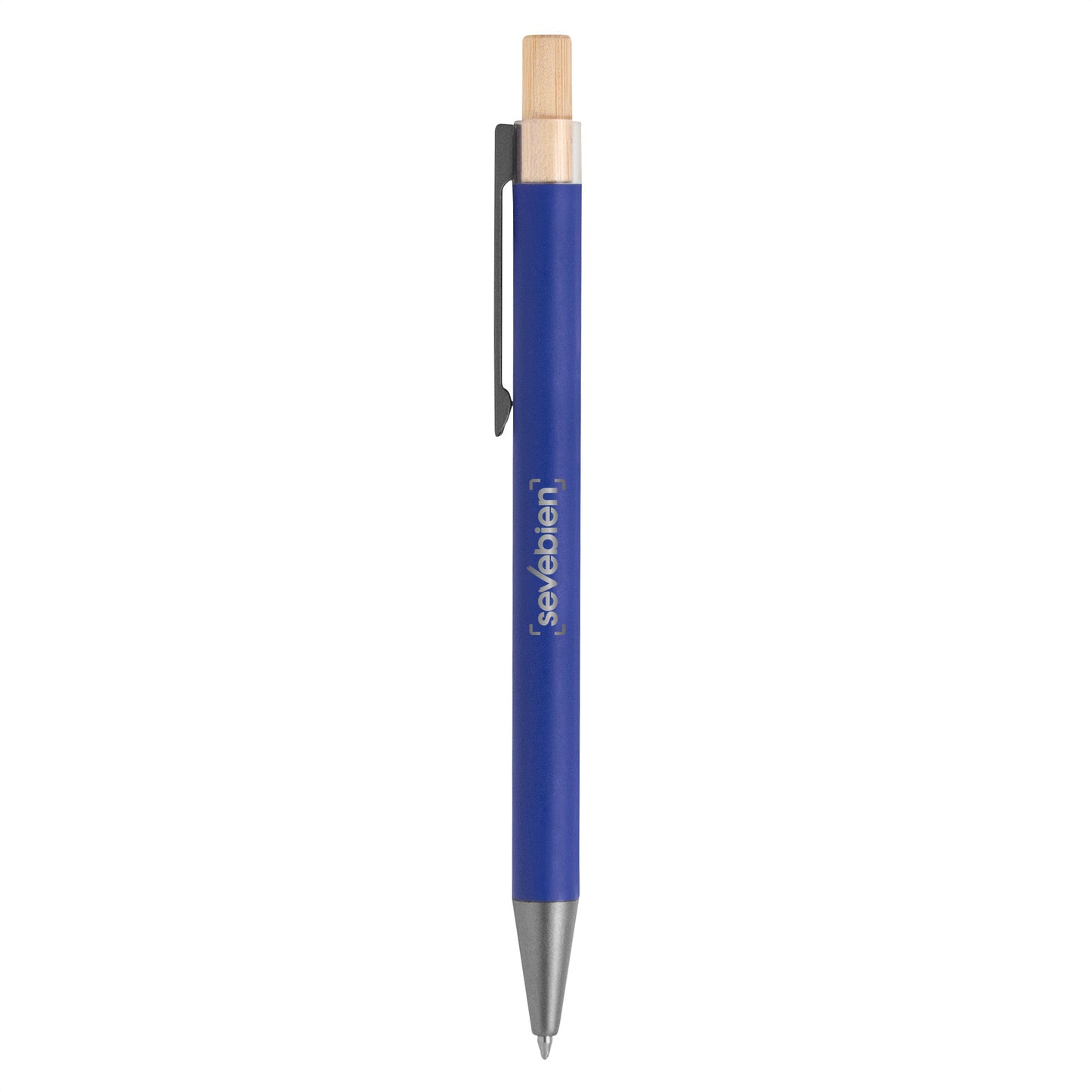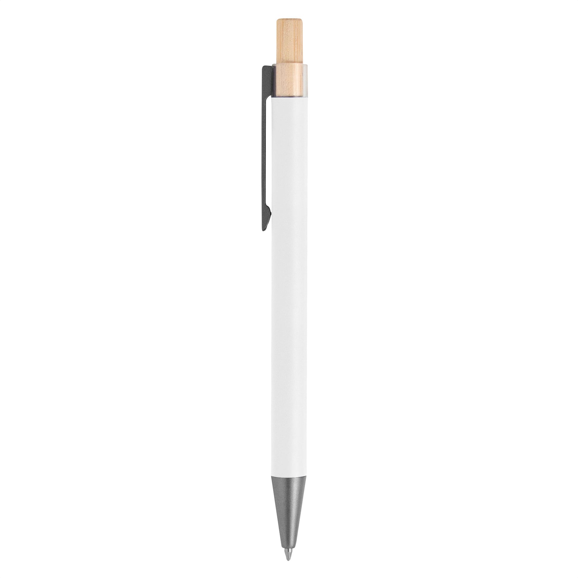 aluminio y bambú. bolígrafo retráctil. cuerpo metálico en diferentes colores acabado mate. clip metálico y puntera plástica color gris acabado mate. pulsador de bambú. tinta negra.