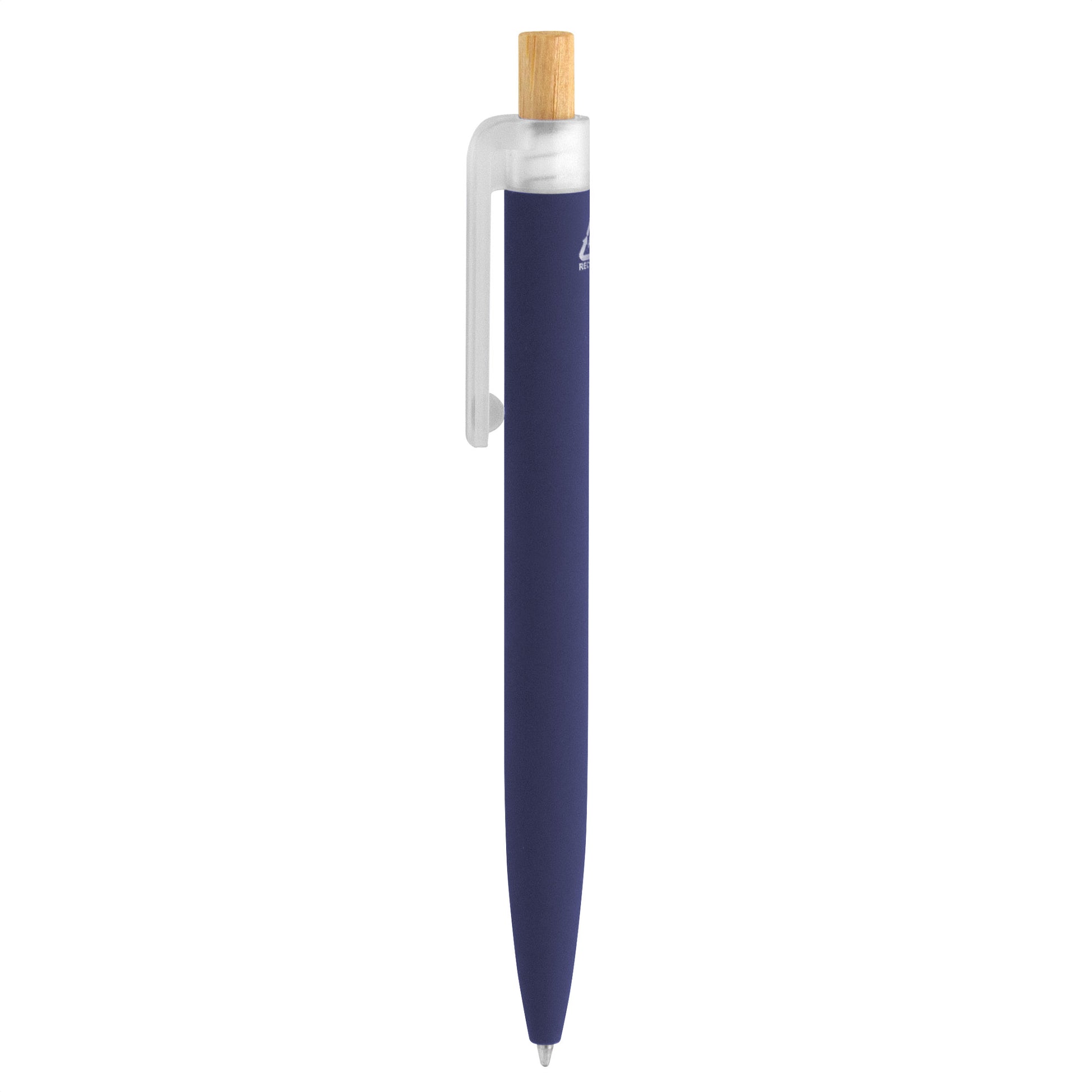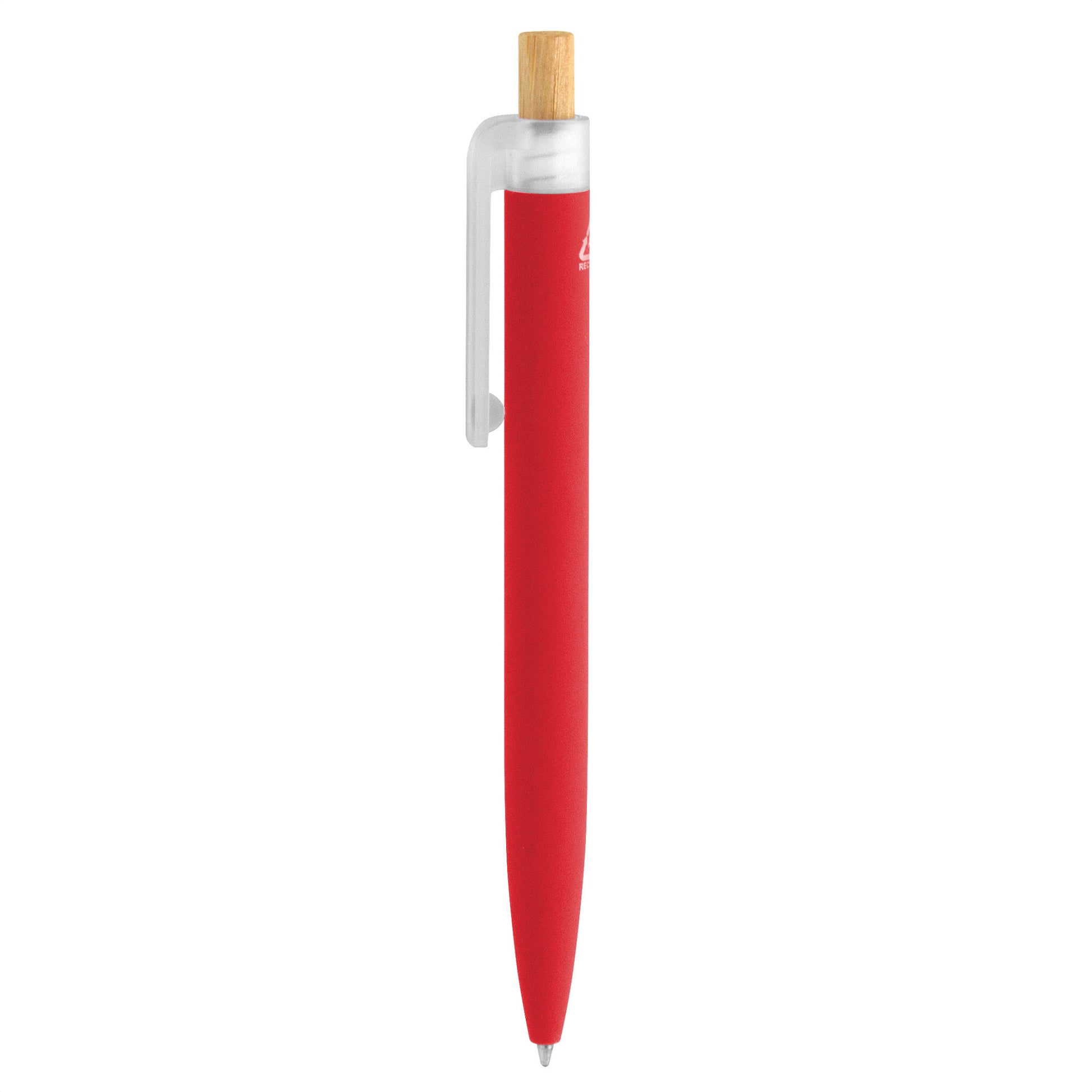 fusiona lo moderno, elegante y ecológico.bolígrafo retráctil. cuerpo de aluminio en diferentes colores, acabado mate engomado, muy suave al tacto. botón pulsador de bambú. clip plástico transparente con terminación frosty.