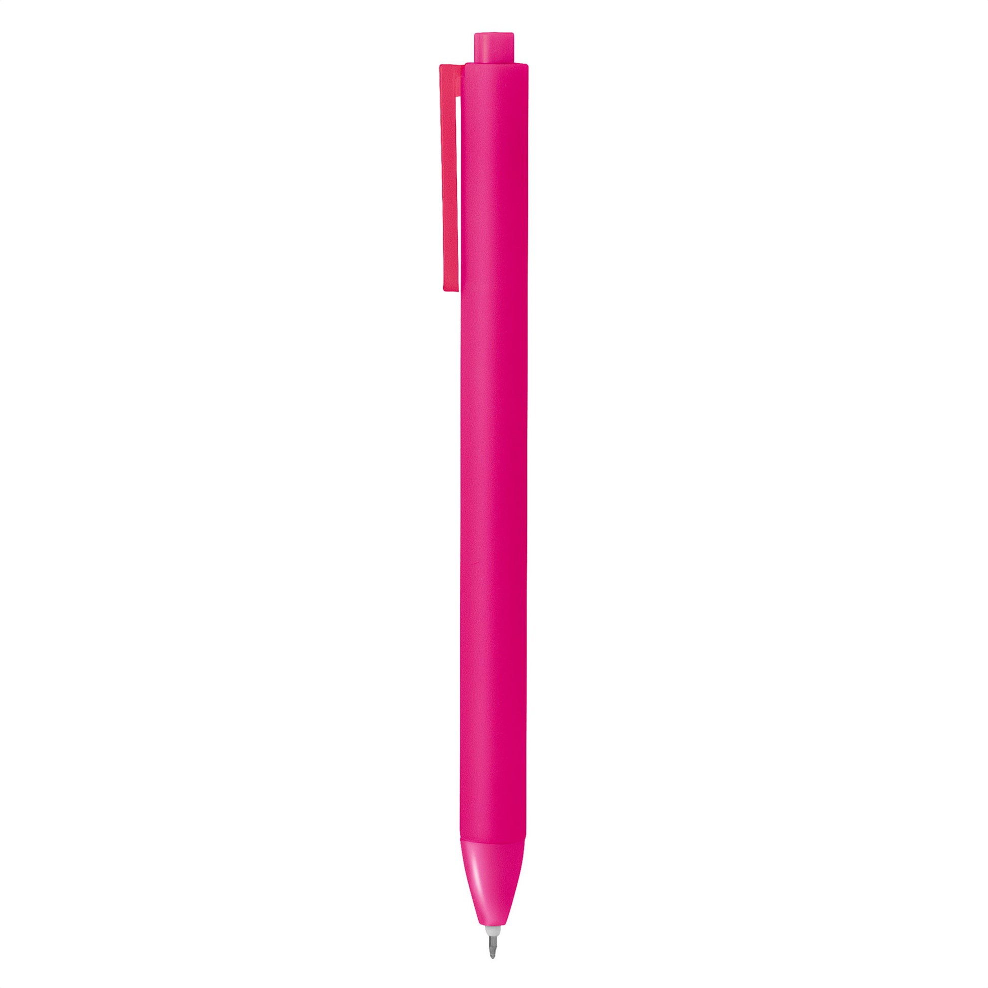 escribe con estilobolígrafo retráctil con tinta gel. cuerpo de diferentes colores con acabado mate suave al tacto. pulsador y puntera del mismo color del cuerpo acabado brillante. clip translúcido del mismo color del cuerpo.