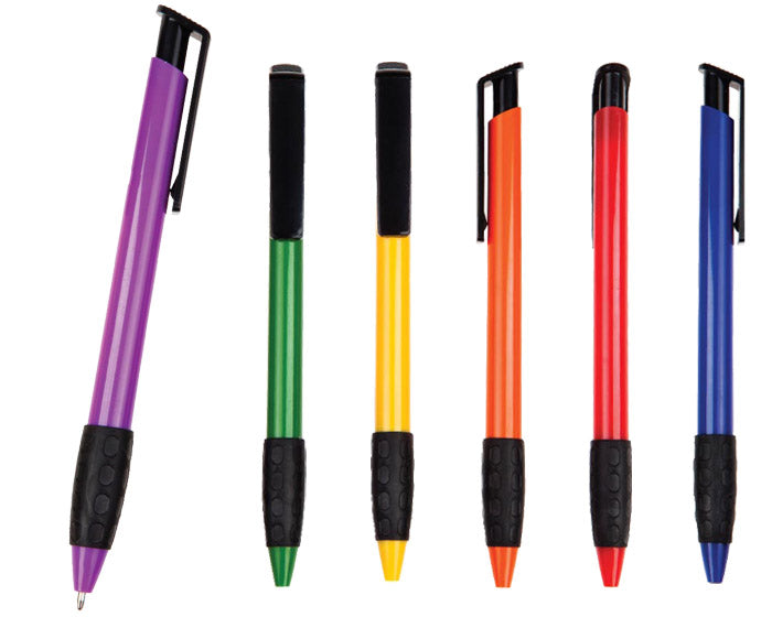 bolígrafo de plástico con goma antideslizante. mecanismo de click.