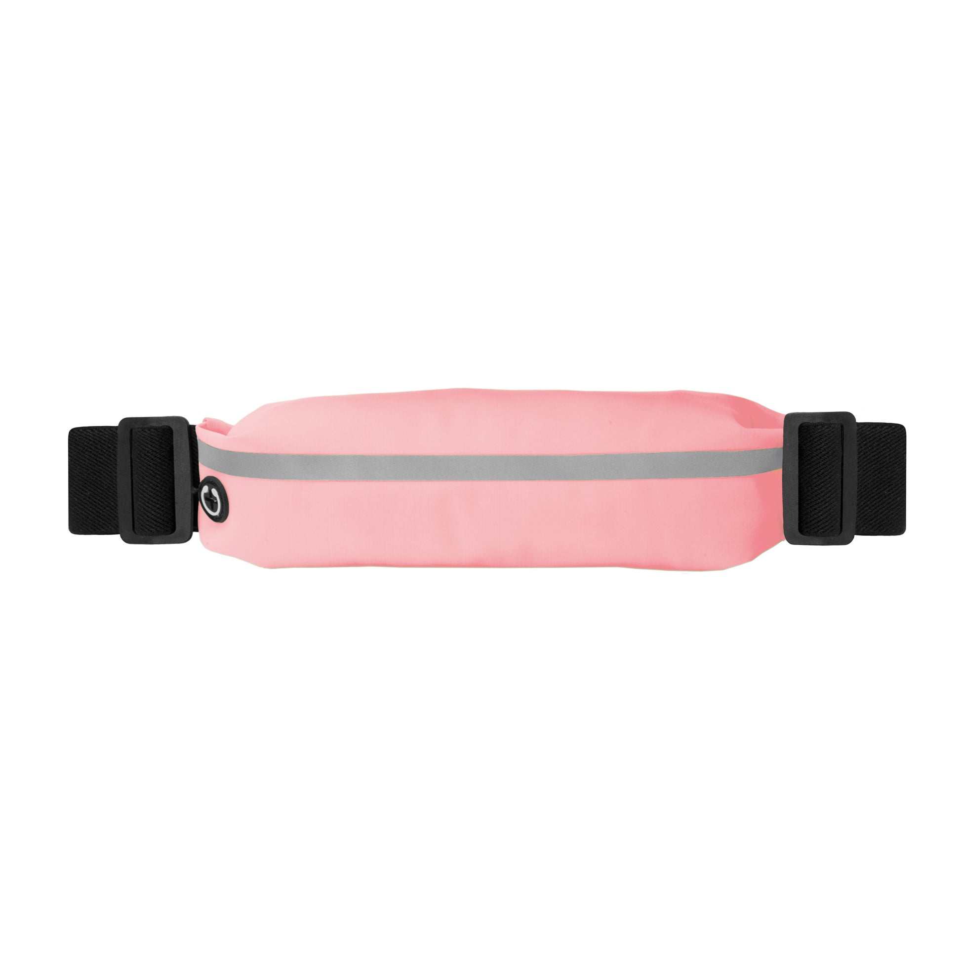 23 cm. x 5 cm. poliamida. cangurera / riñonera deportiva. unico compartimento con cierre metálico, salida para auriculares, faja reflectante y correas elásticas con longitud aproximada de 88 cm. el material es impermeable.