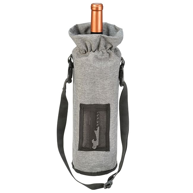 Capacidad para una botella. Interior insulado térmico. Bolsillo mesh al frente. Incluye sacacorchos. Correa larga ajustable