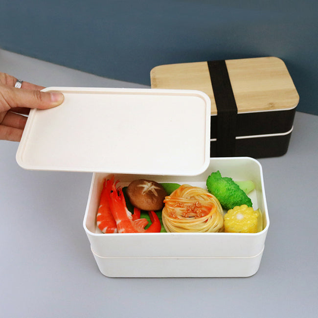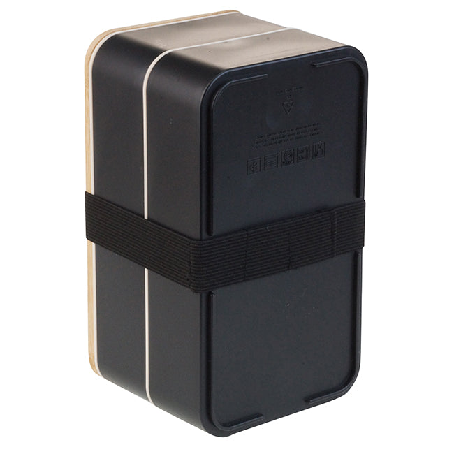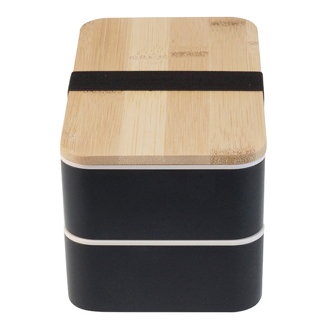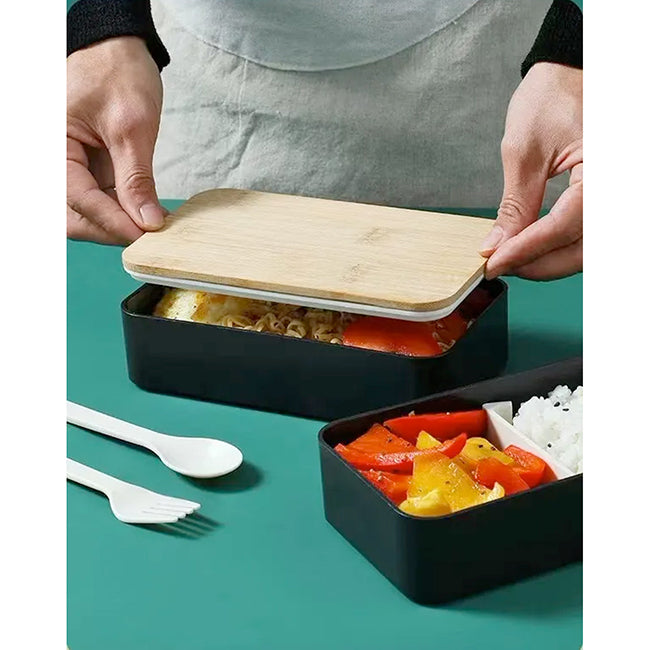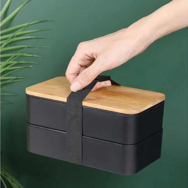 Doble Lucnh-Box Polaris Dos recipientes con cinta elástica para sujetar. Tapa de bamboo. Puede introducirse en microondas. Barra divisoria movible. Tapa intermedia con juego de cubiertos: cuchara, tenedor, cuchillo.