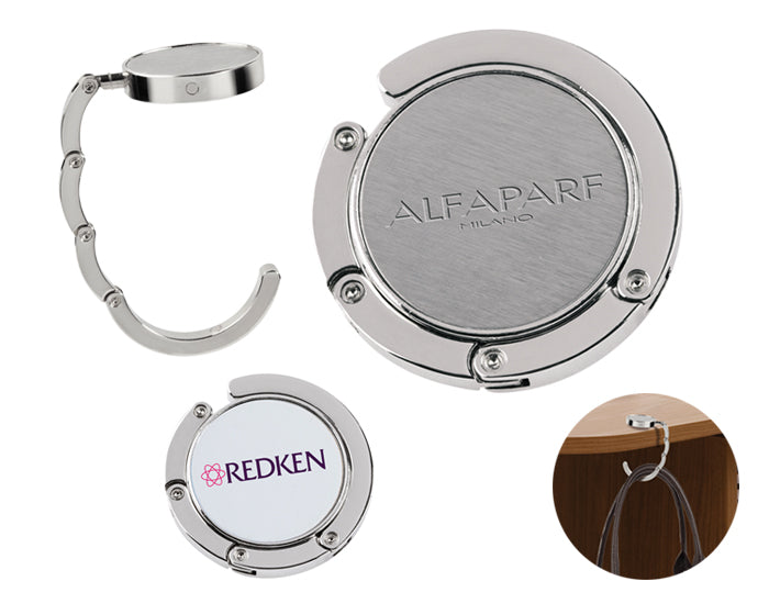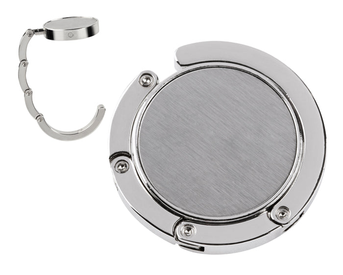 gancho colgador de bolsas para superficies planas. modelo para grabado láser y modelo con recubrimiento en color blanco para gota de resina y serigrafía. presentación: caja individual en color negro.