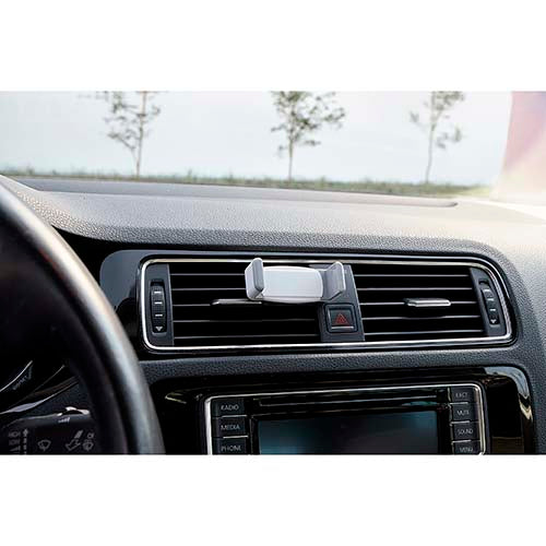 soporte con mecanismo ajustable para smartphones de 6 a 8 cm de ancho. ángulo de rotación de 360°. se monta en las ventilas del aire acondicionado.