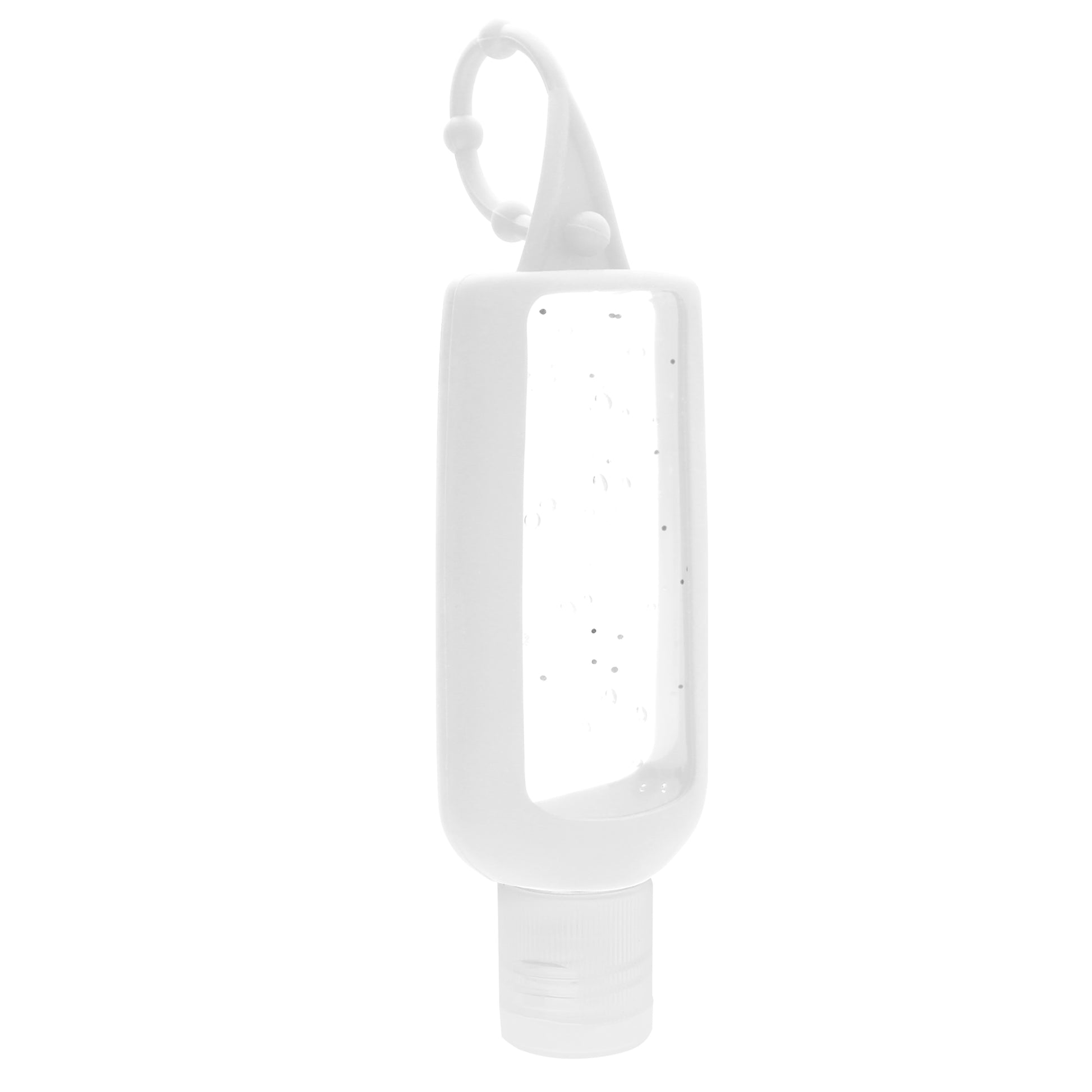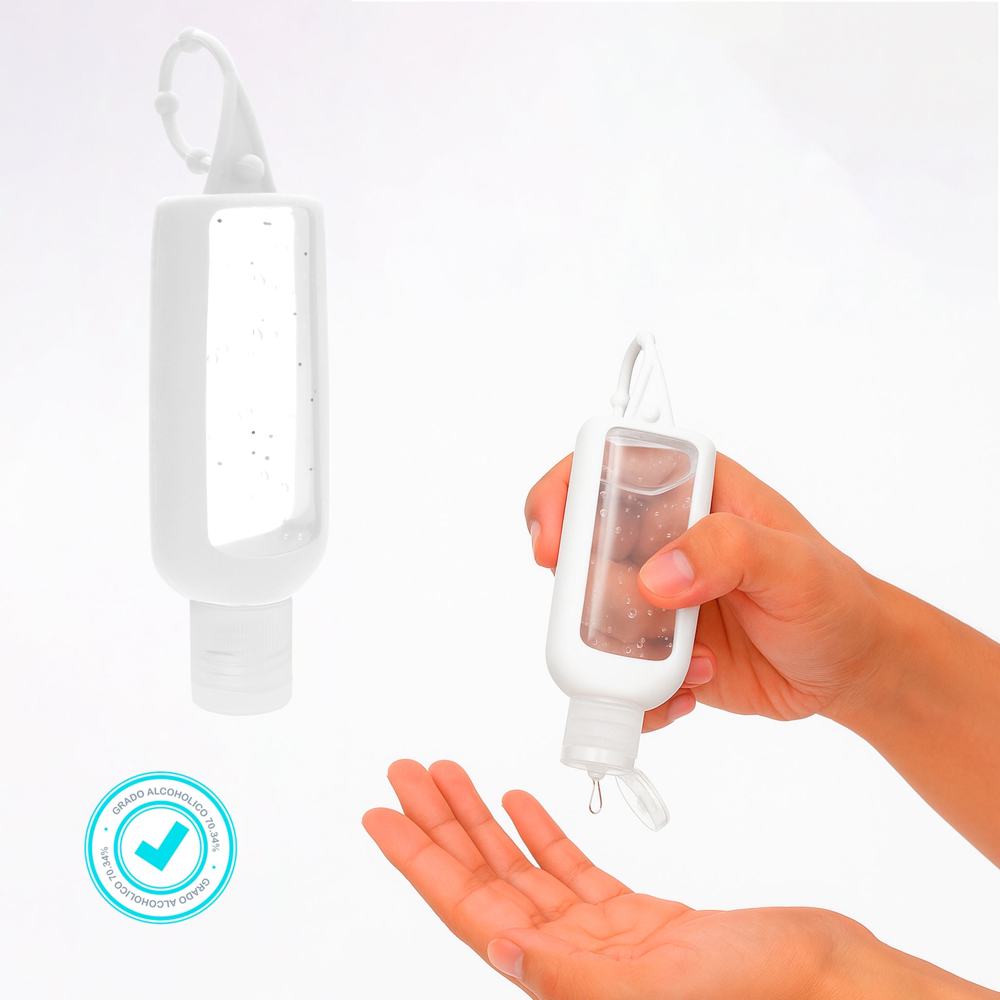 gel antibacterial en botella de plástico con funda de silicón. porcentaje de alcohol: 70 %.