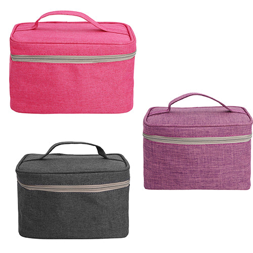 cosmetiquera de poliéster en forma rectangular con dos compartimientos y asa.