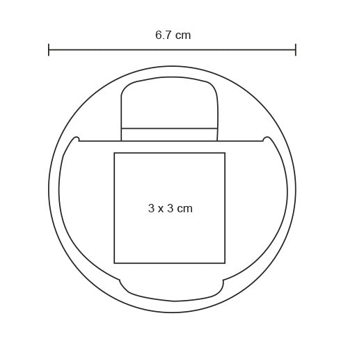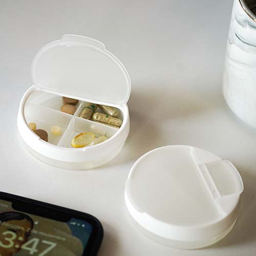 pastillero de plástico con 4 compartimentos, 2 broches, tapa traslúcida y parte superior giratoria.