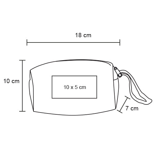 cosmetiquera con acabado glitter, cierre y correa de plástico intercambiable.