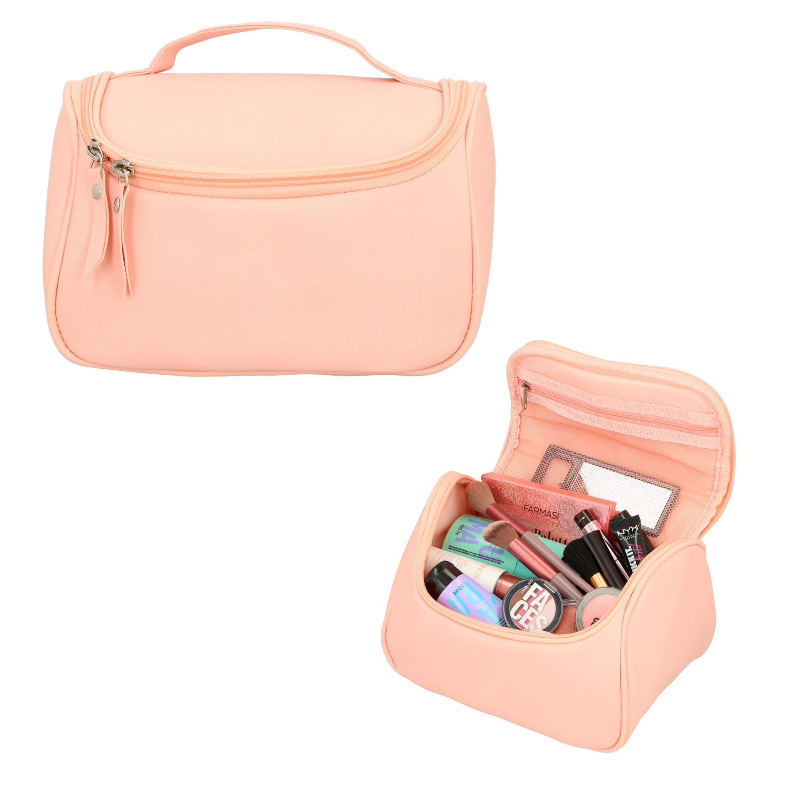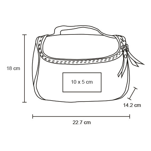 cosmetiquera con interior forrado, un compartimento con malla, cierre y en la parte exterior cuenta con asa.