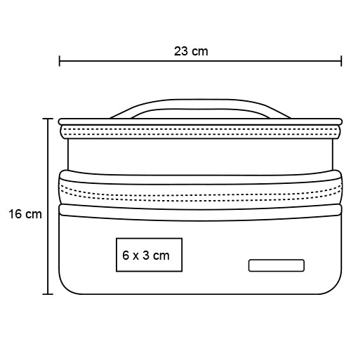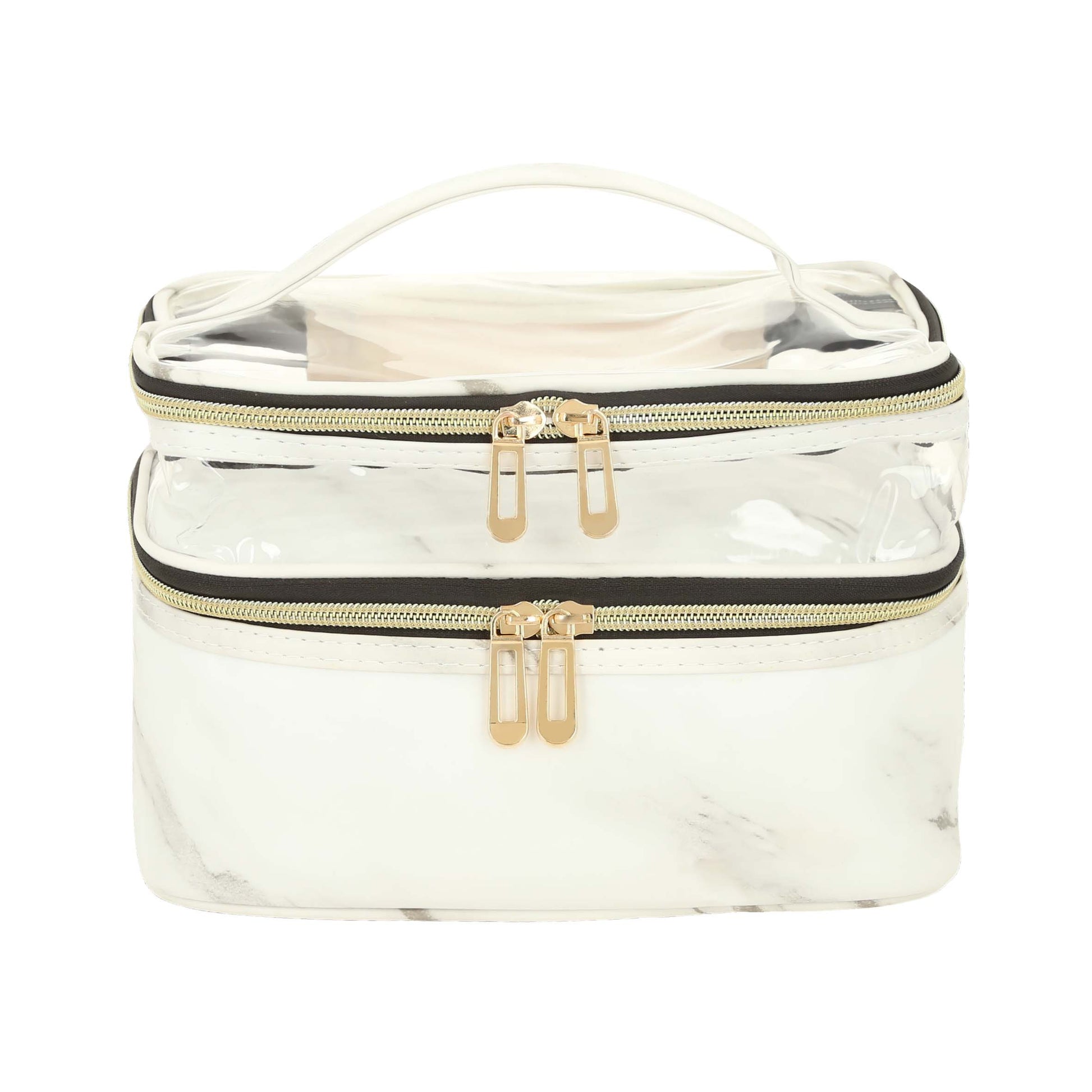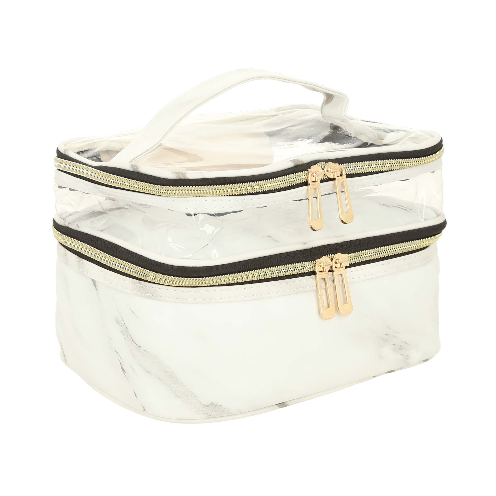 cosmetiquera con apariencia de mármol, doble nivel, uno color sólido, uno transparente con asa en la parte superior y fuelle de 17 cm.