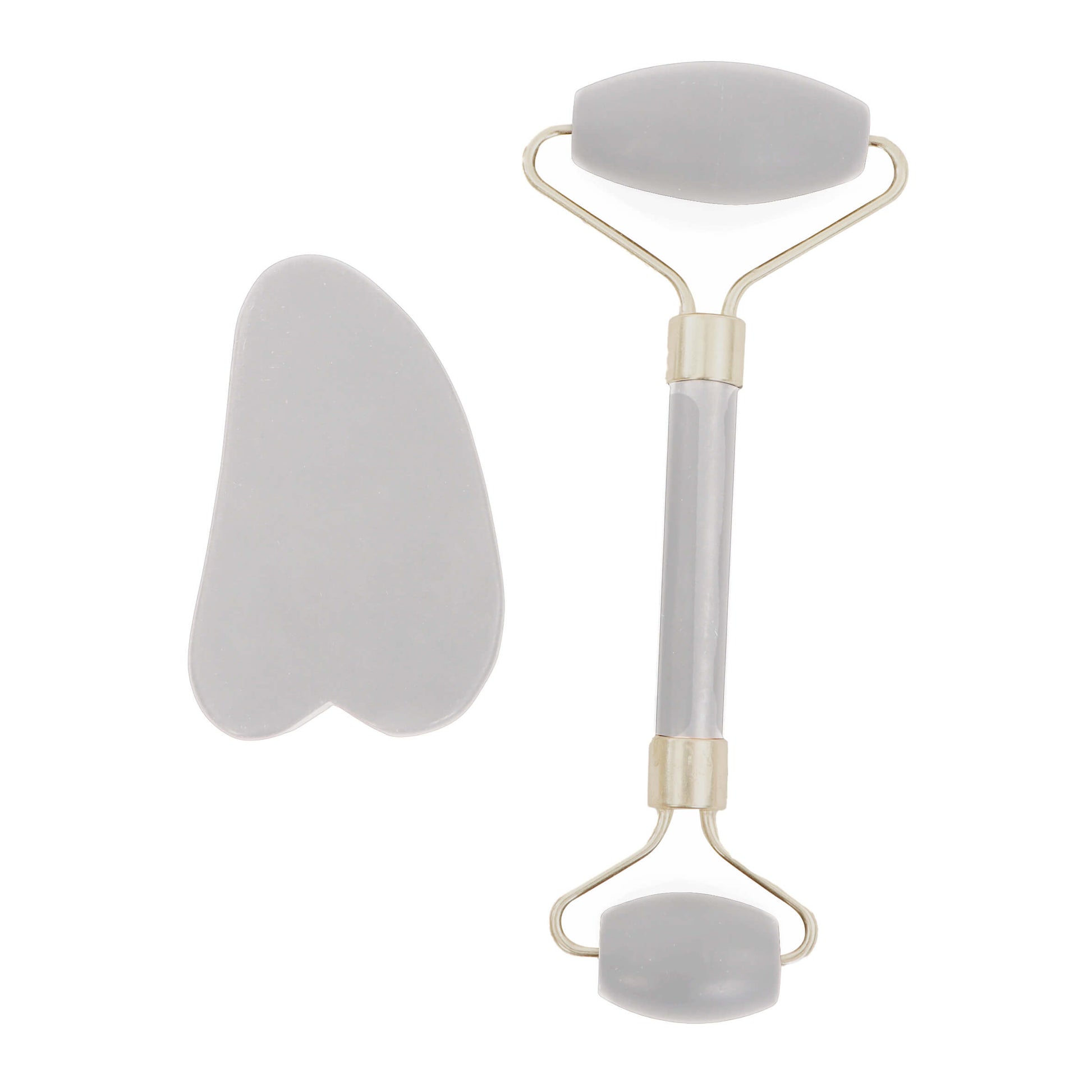 kit de masajeadores para el rostro que incluye rodillo y piedra gua sha.