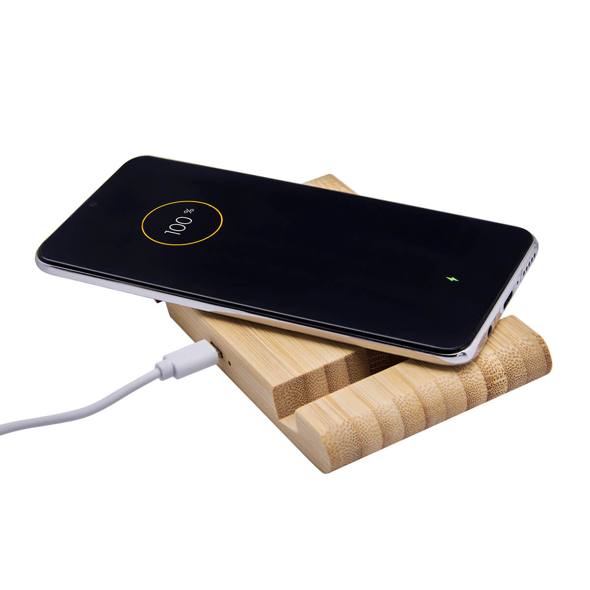 cargador inalámbrico multifunción con soporte para smartphones y tablets. incluye led indicador de carga en proceso y cable con entrada usb y micro usb. potencia de carga de 5w. incluye cable cargador. el bambú es un producto natural el cual puede presentar variaciones en tonalidades y vetas.