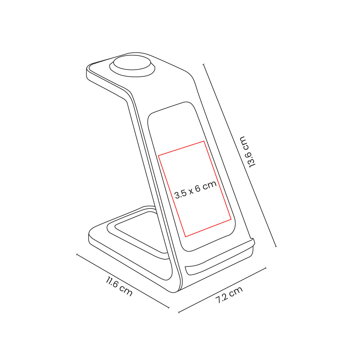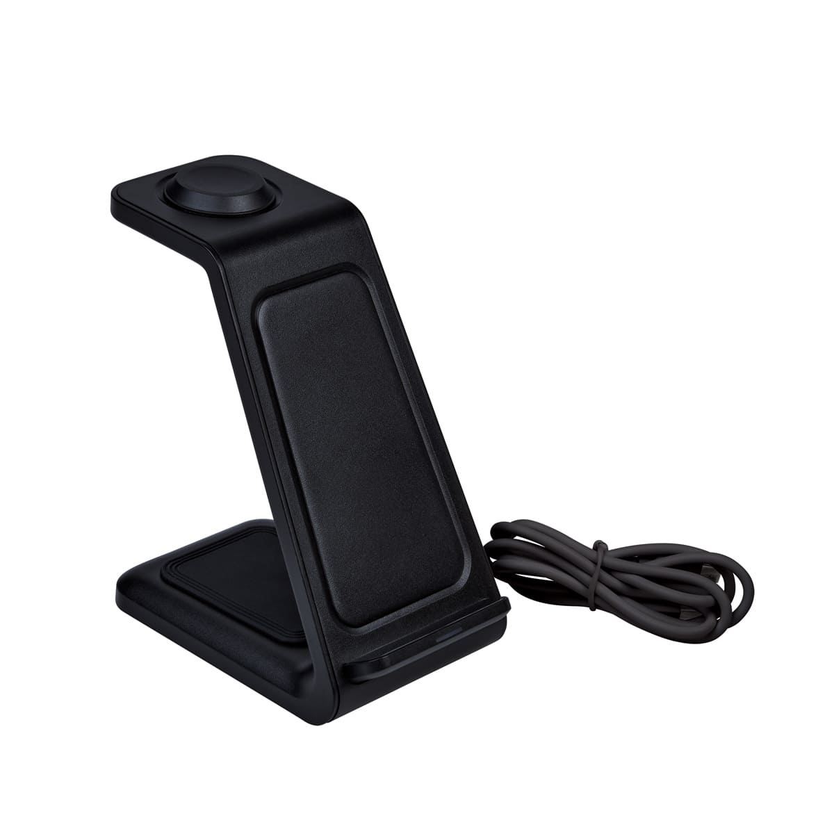 cargador inalámbrico con triple función. incluye estación de carga para smartphone, reloj inteligente y audífonos. wireless de 15w / 10w / 7.5w / 5w / 3w. incluye cable de 1m con conector tipo c. compatible con dispositivos que cuenten con tecnología de carga inalámbrica.