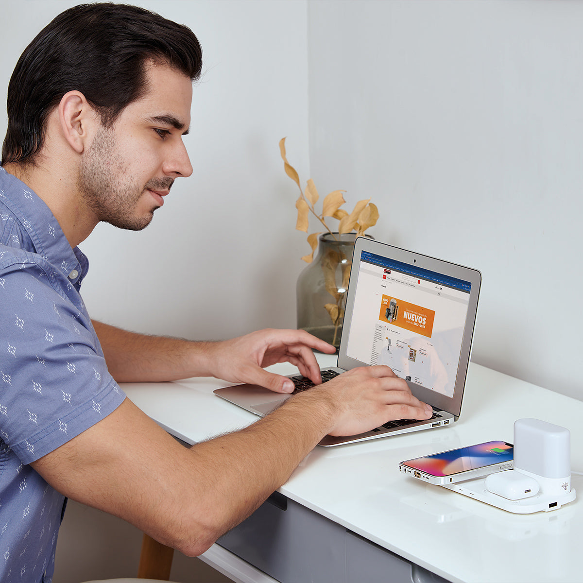 cargador inalámbrico para smartphone y earbuds. incluye lámpara touch con 3 diferentes intensidades. salida usb para conectar otro dispositivo como por ejemplo un smartwatch. incluye cable auxiliar tipo c y caja individual.