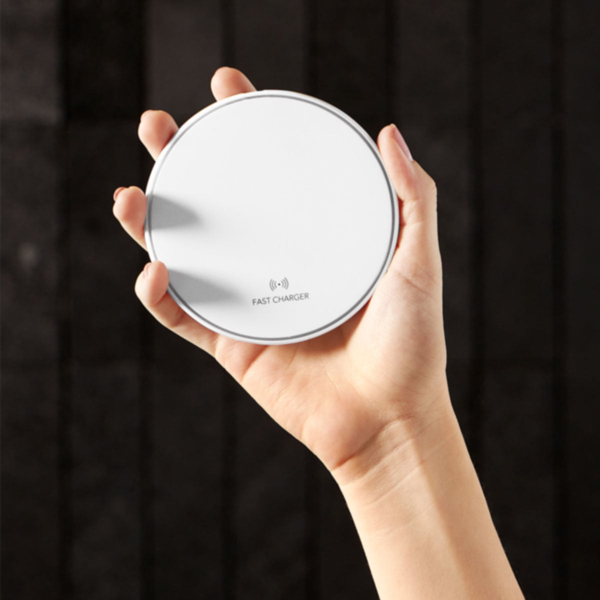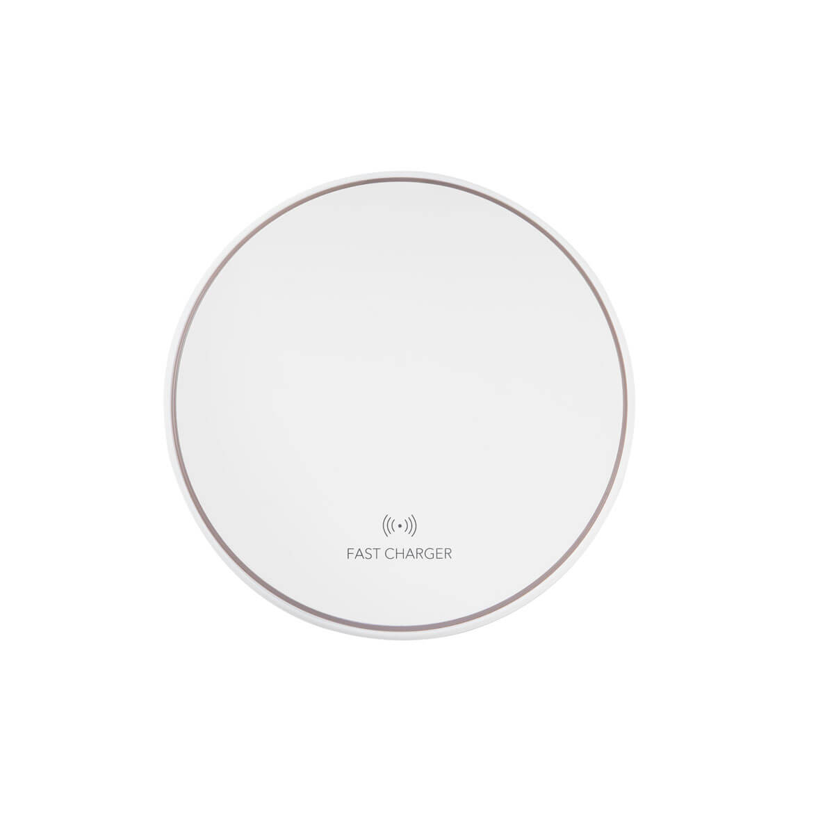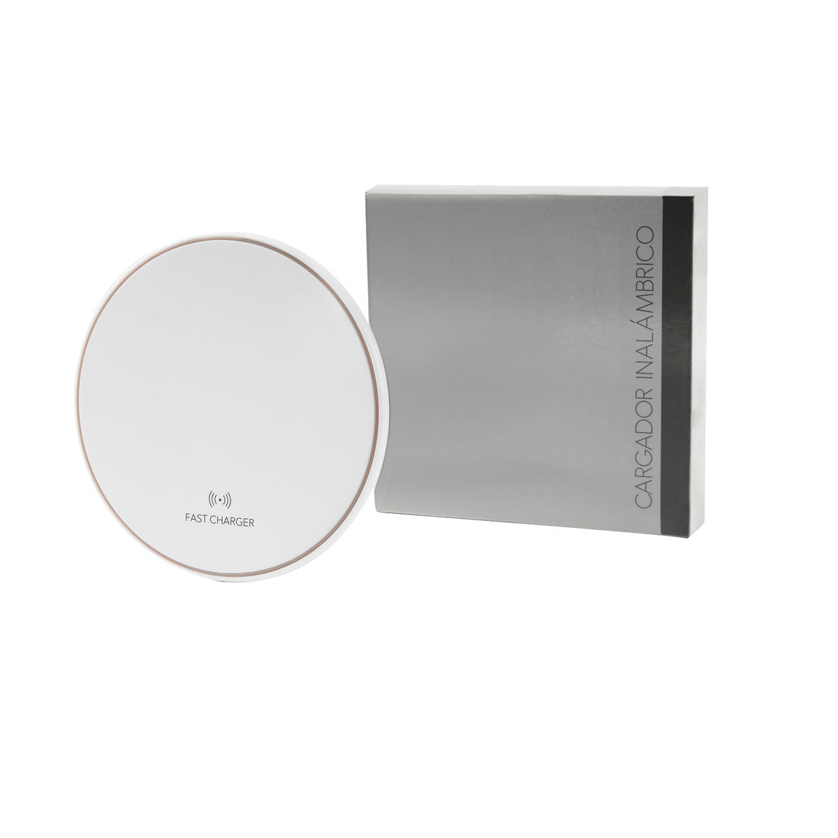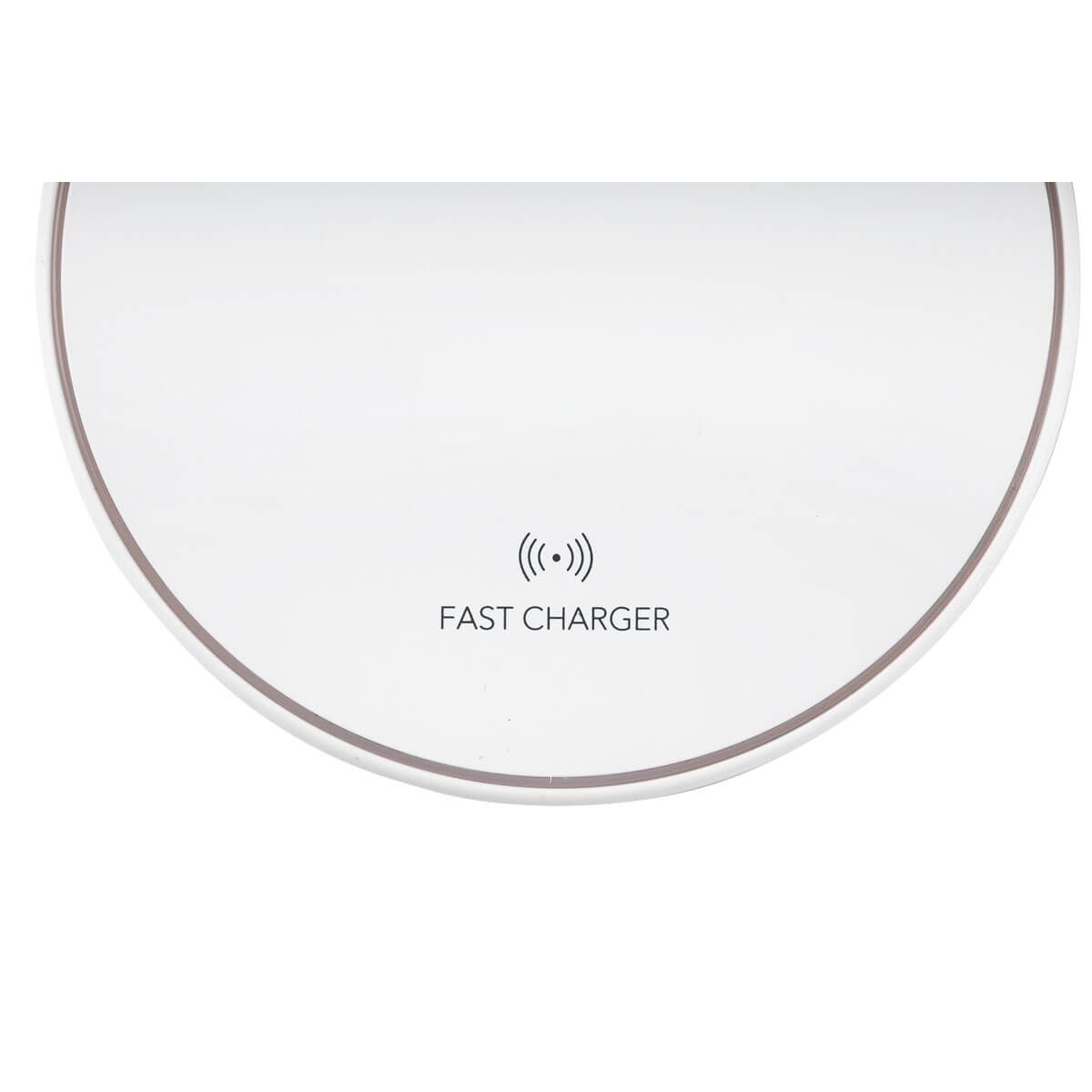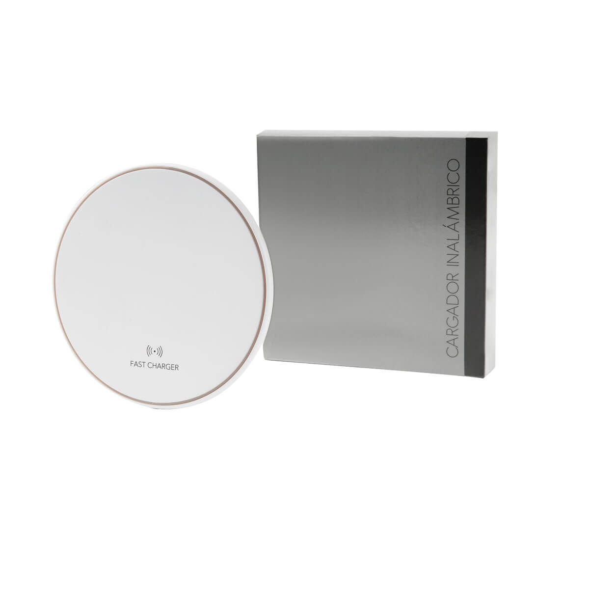 cargador inalámbrico "fast charge". velocidad máxima de carga 15w. se enciende luz color verde cuando está en reposo y luz color azul cuando está en proceso de carga. incluye cable auxiliar tipo c y caja individual.