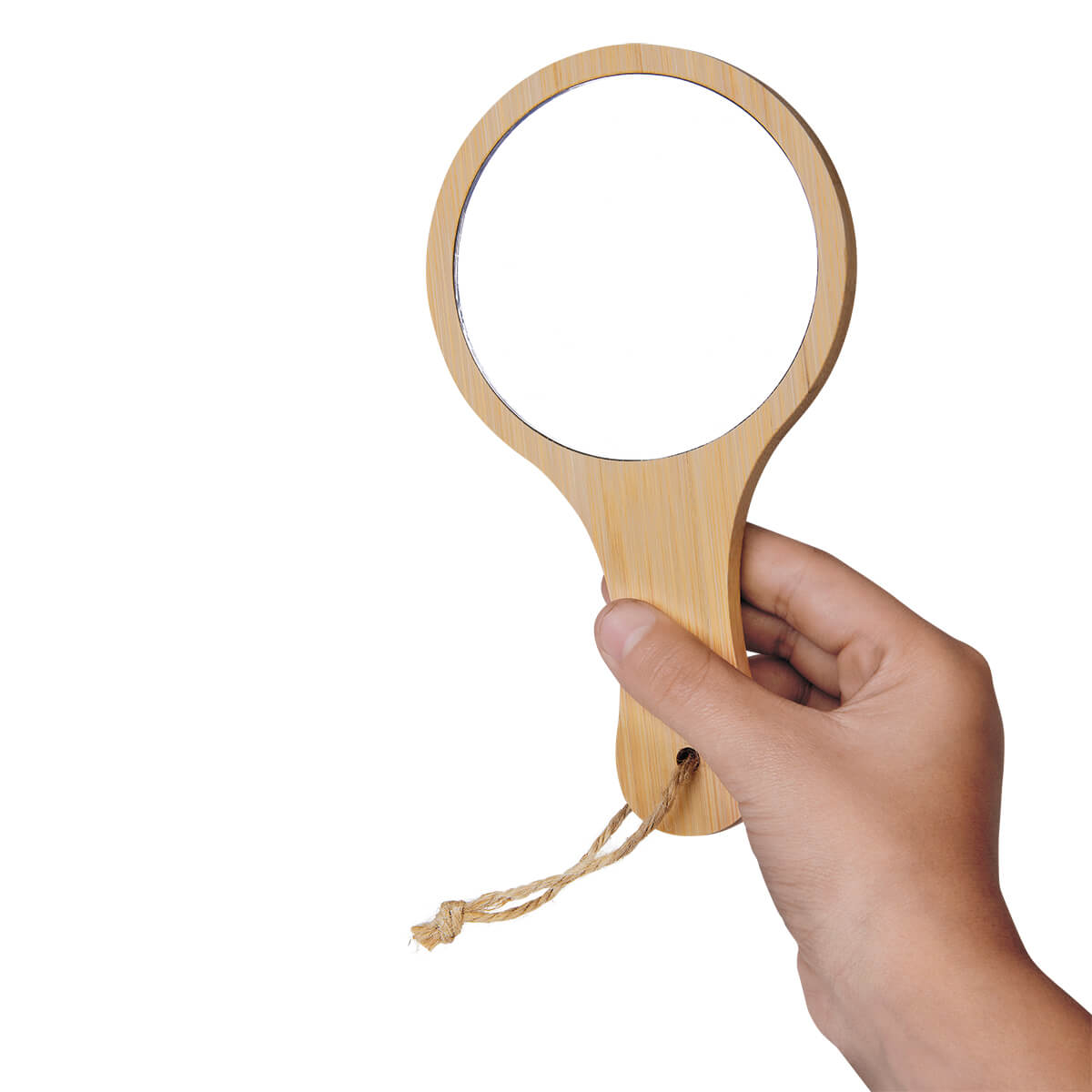 espejo de bambú con mango. incluye cordón.