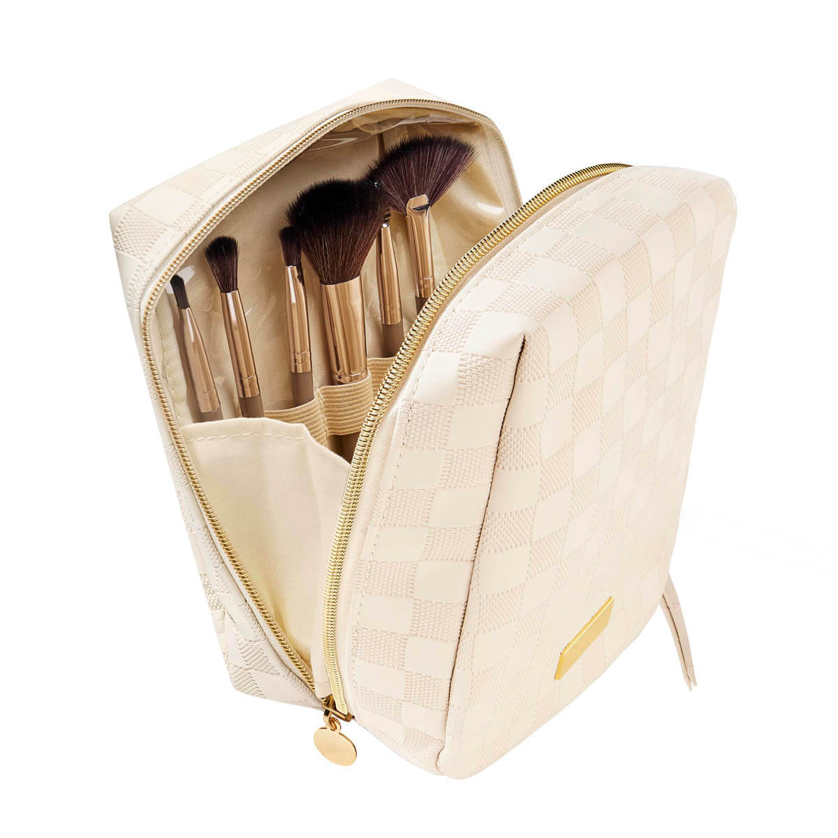organizador de cosméticos.compartimento con abertura amplia facilita el acceso y la organización de brochas y accesorios, manteniéndolos siempre en orden y a la vista. además, la placa metálica al frente añade un toque de distinción. ideal para quienes valoran la practicidad en su rutina de belleza.