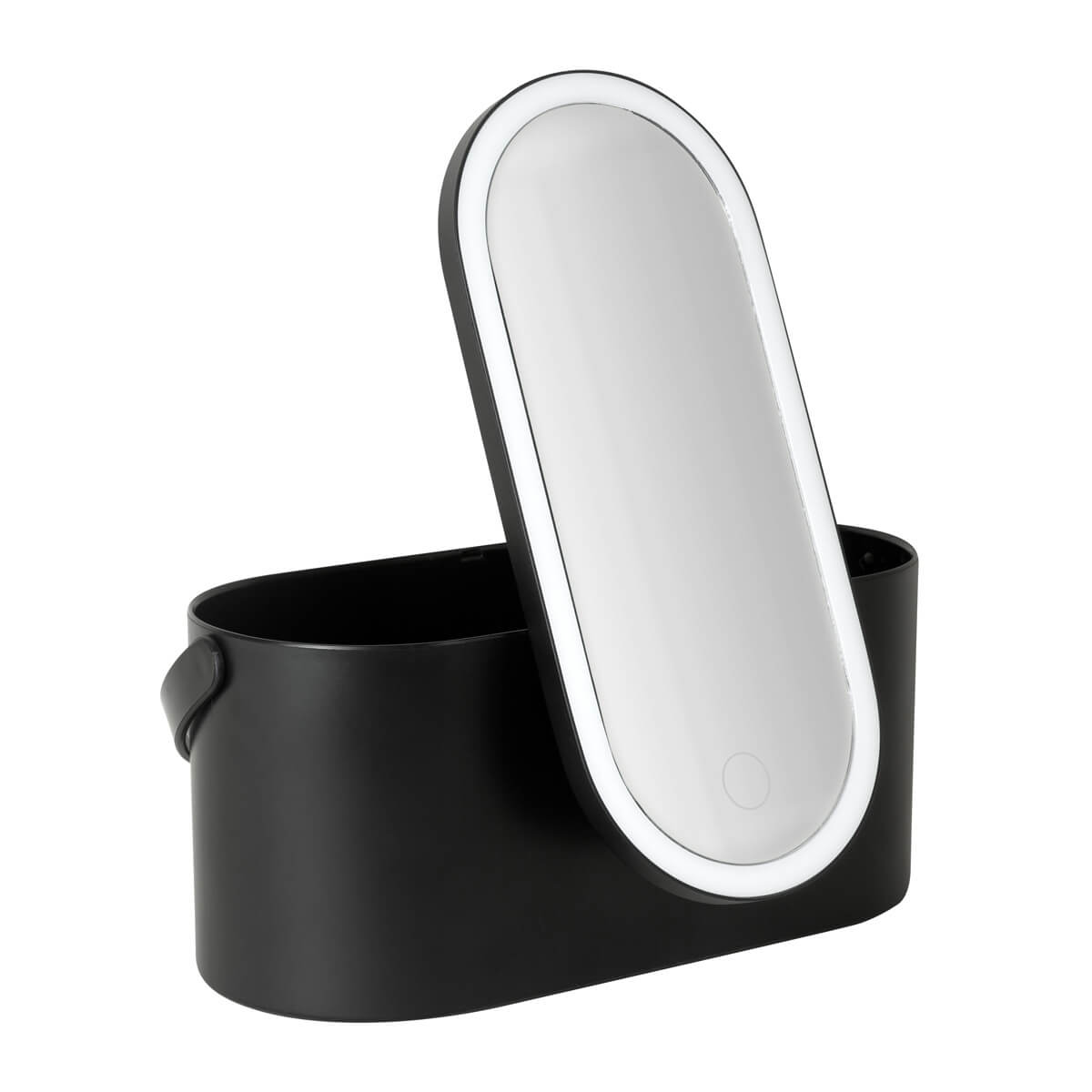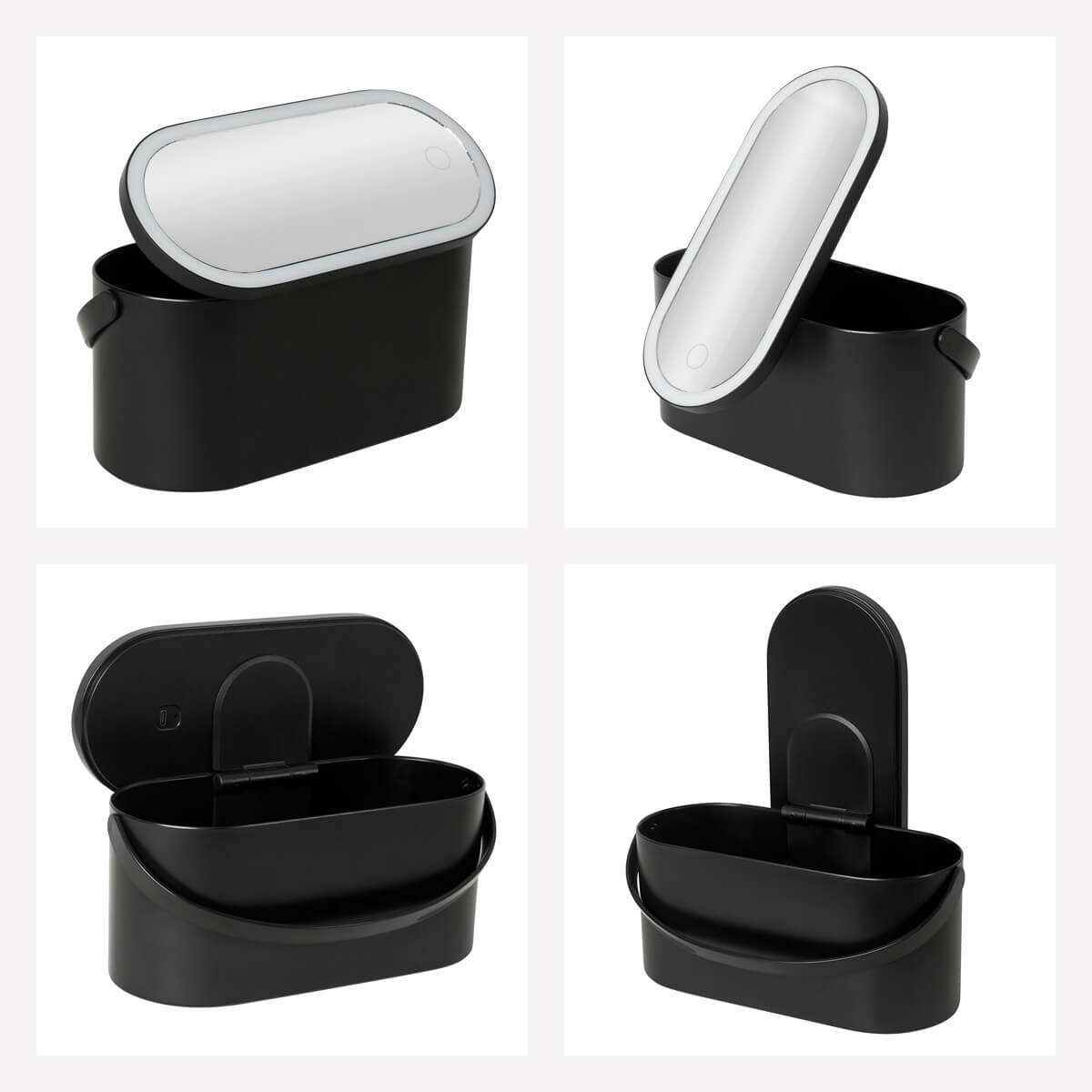 organizador de cosméticos con espejo integrado. su tapa incluye un espejo con luz led ajustable a 3 intensidades, se activa presionando por 5 segundos el botón touch. el diseño versátil permite ajustar el espejo en diferentes posiciones, incluso desmontarlo y utilizarlo de manera individual, brindando comodidad y precisión al maquillarte. compacto y elegante, es el accesorio ideal para mantener tus accesorios organizados. batería recargable e incluye cable con conexión usb-c y caja individual.