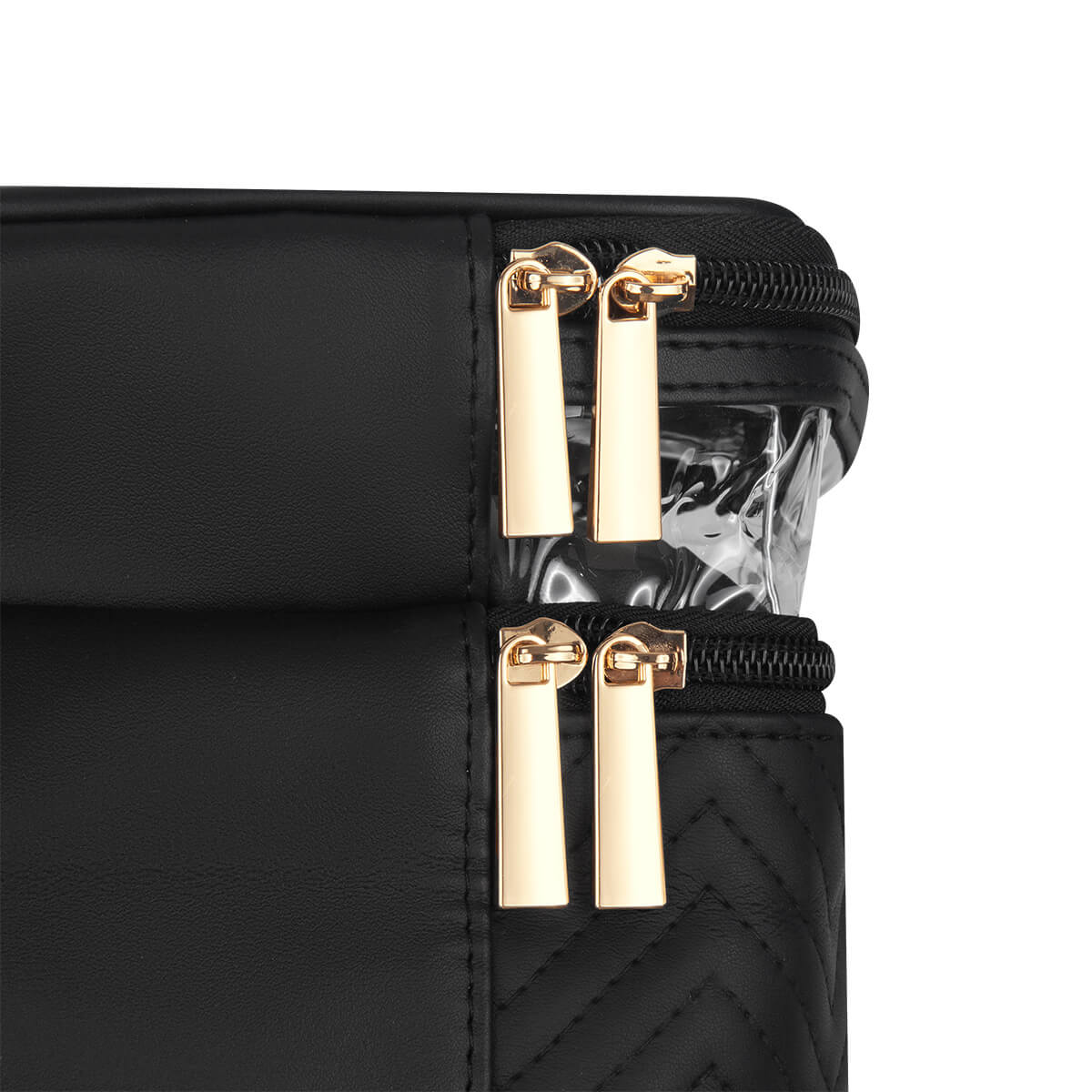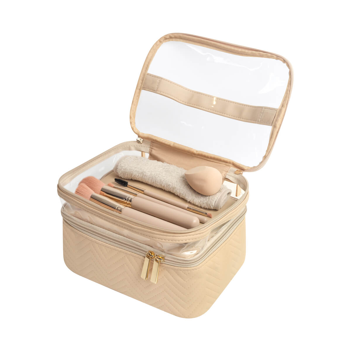 neceser fabricado en pu con cuerpo semirrígido. cuenta con dos niveles con cierre, ideales para organizar y separar productos de belleza o higiene personal. su panel superior de mica transparente permite visualizar el contenido fácilmente, mientras que el asa facilita su transporte. ideal para guardar productos de belleza, cuidado personal o maquillaje.