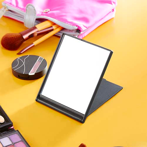espejo rectangular de bolsillo. la tapa sirve como base.