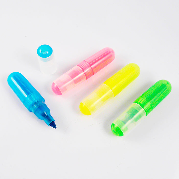 juego de 4 marca textos de colores vibrantes. fabricados en plástico. incluye un estuche de plástico color negro con tapa transparente y detalle en la parte inferior de color para mayor protección. tamaño práctico.