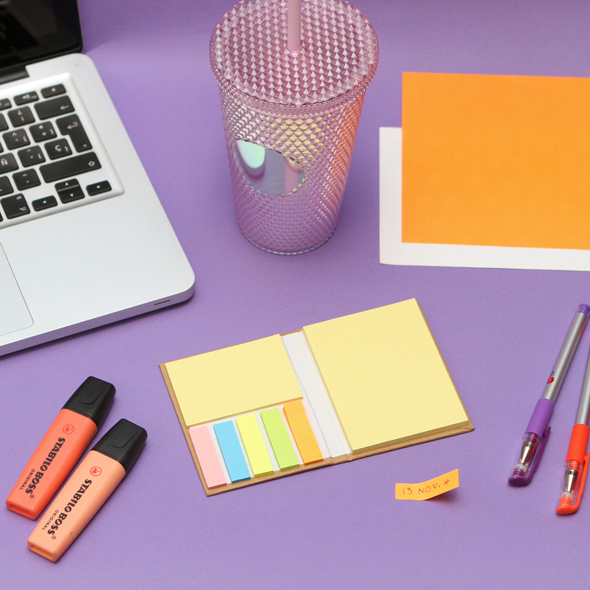 libreta ecológica de pasta rígida con notas adhesivas en color amarillo y banderitas de colores adhesivas.