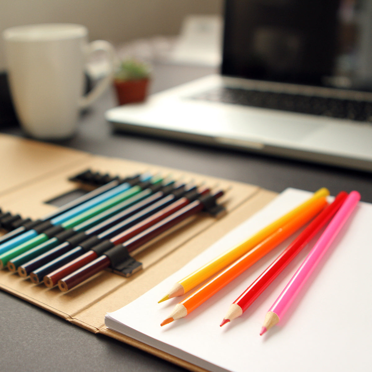 set ecológico de pastas rígidas con suaje al frente fabricado en cartón con 12 lápices de colores, resortes sujetadores y block con 50 hojas blancas.
