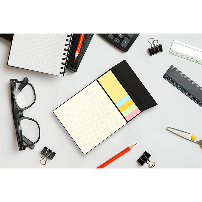 block de notas con 70 hojas de cuadricula detalle en pu y banderines adheribles.