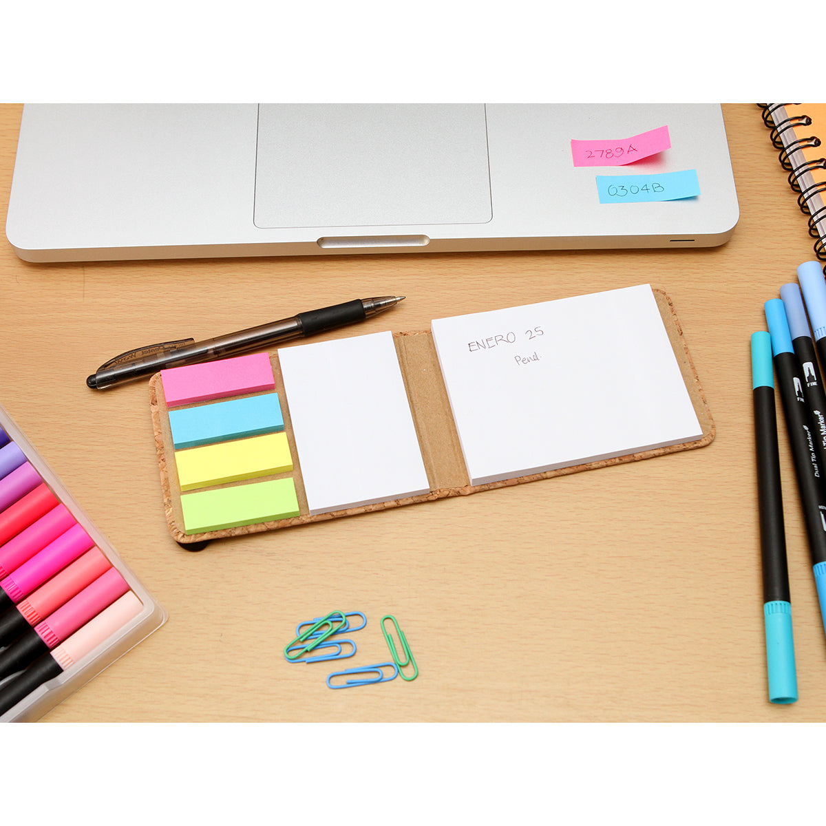 set de notas de bolsillo con pasta de corcho y banda elástica color negro, incluye 50 banderines adheribles en 4 colores.