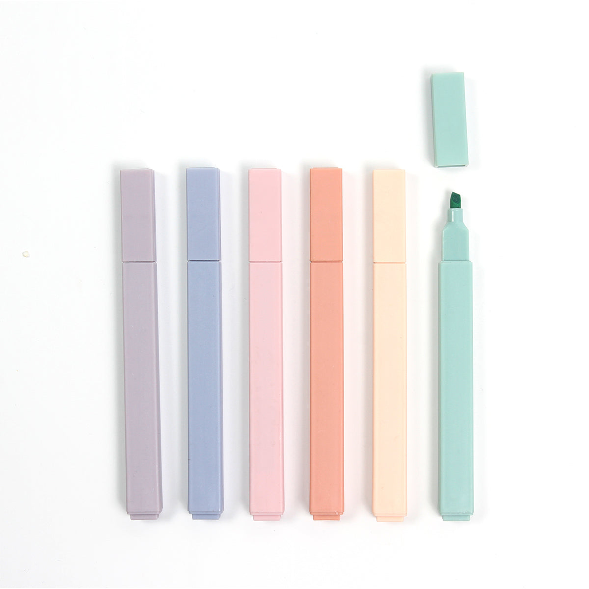 set de 6 marcadores de texto en tonalidades pastel con cuerpo cuadrado. el set incluye colores en azul, morado, naranja, rosa, rojo y verde. tinta del mismo color que el cuerpo del marcador. ideales para la oficina o el colegio.