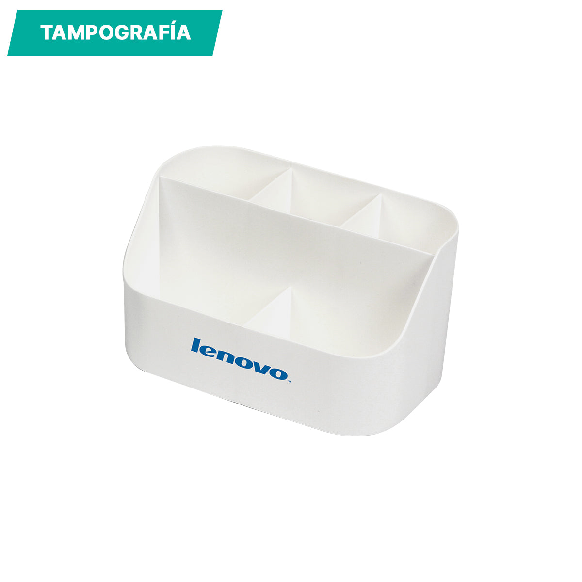 organizador de escritorio fabricado en plástico, cuenta con cinco compartimentos para bolígrafos, plumas, u otros objetos de papelería.