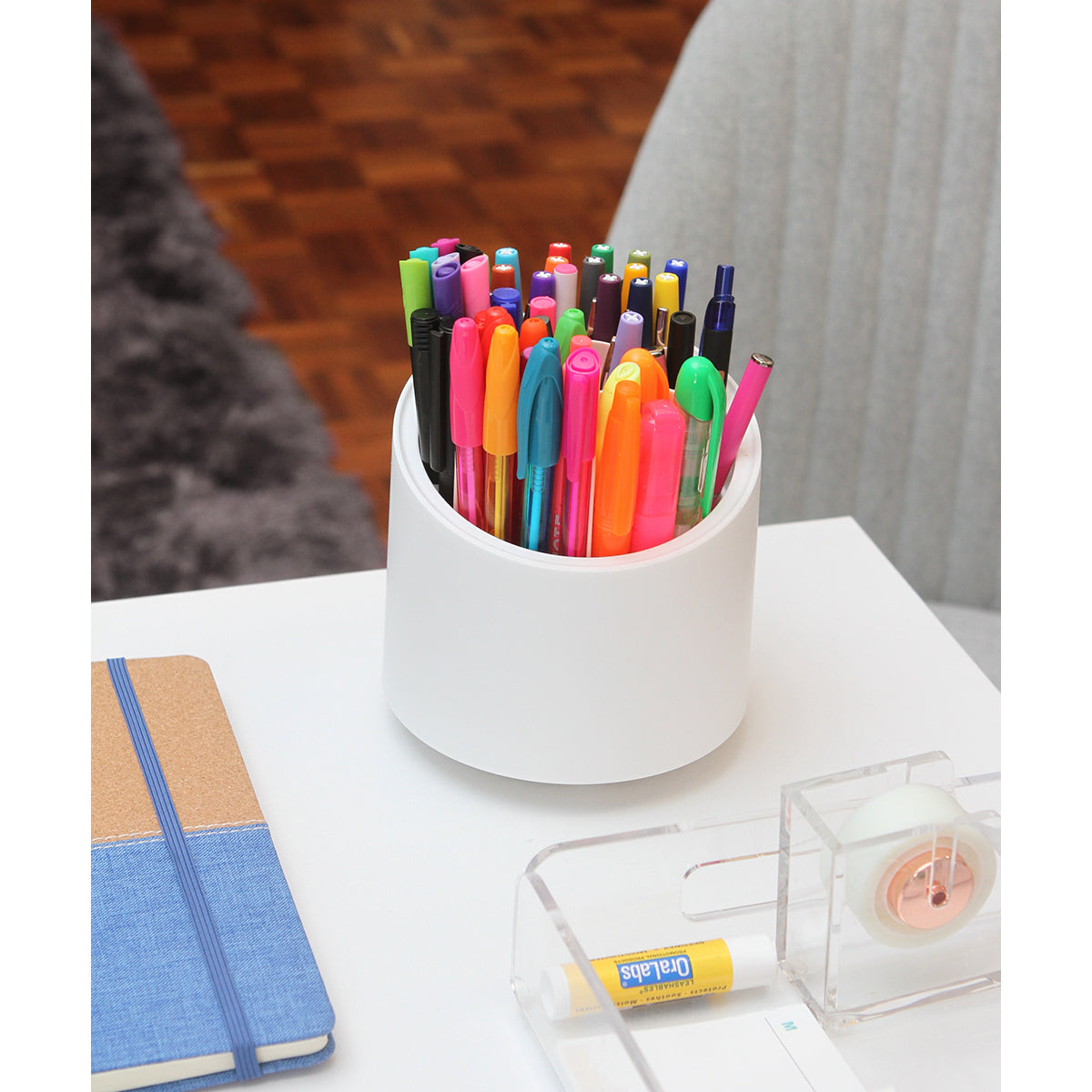 organizador de escritorio fabricado en plástico, cuenta con siete compartimentos para bolígrafos, plumas, u otros objetos de papelería.