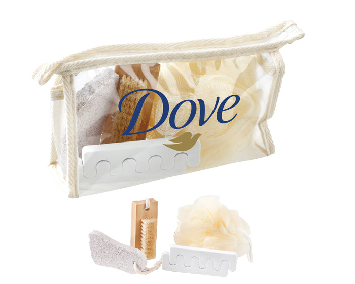 mini kit para el cuidado de los pies en bolsa plástica con cierre. contenido: cepillo para pies, separador de dedos, piedra exfoliante y esponja de baño corporal.