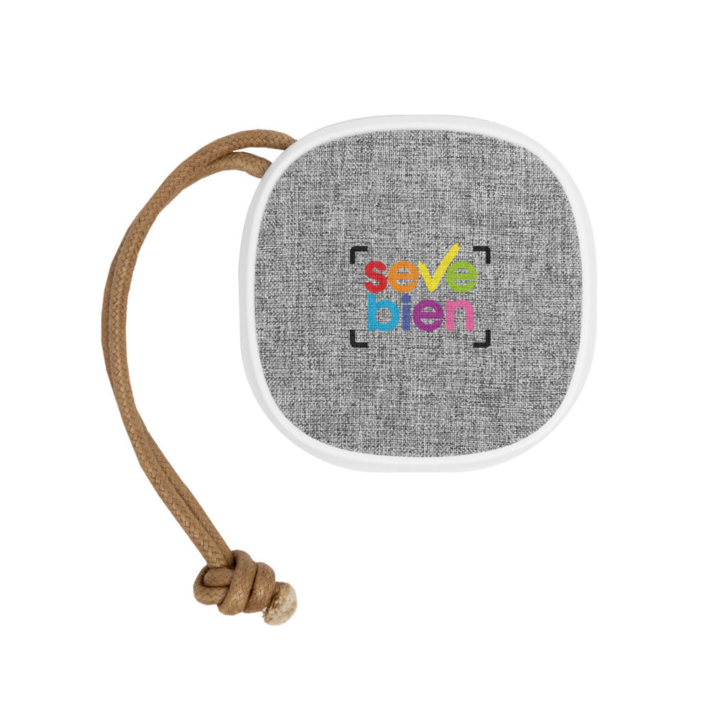 9 x 9 x 4,4. plástico. bocina bluetooth cubierto en tela. en la parte inferior engomado antideslizante con botones para encender o apagar, play/pausa y responder llamadas. botón de retroceso y avance, este último, si se mantiene presionado durante unos segundos pasa al siguiente sonido, estos mismos botones permiten aumentar o disminuir el volumen. puerto de carga usb-c. incluye cable. lazo de tela color marrón que permite colgarlo. duración de la batería 8 - 12 hs aprox. presentación en caja de regalo. potencia: 3 watts x 1 versión bluetooth: 4.2 capacidad batería: 1200 mah alcance: 10 mts. aprox