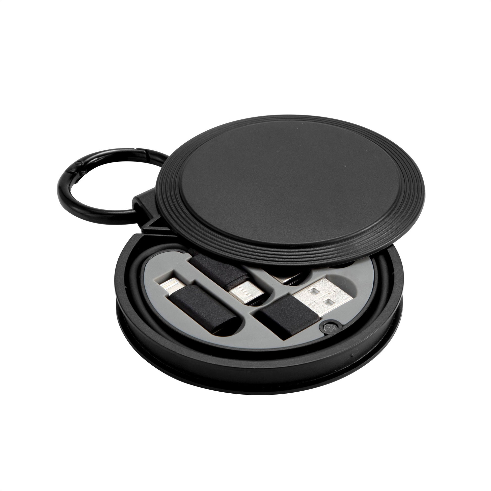 un cable, todas las conexionescable de carga rápida. estuche circular con mosquetón. accesorios: 1 cable de carga rápida usb tipo c a usb tipo c de 60 w con transferencia de datos, 1 adaptador usb standard, 1 adaptador lightning y 1 adaptador micro usb. cierre magnético. apertura por deslizamiento.
