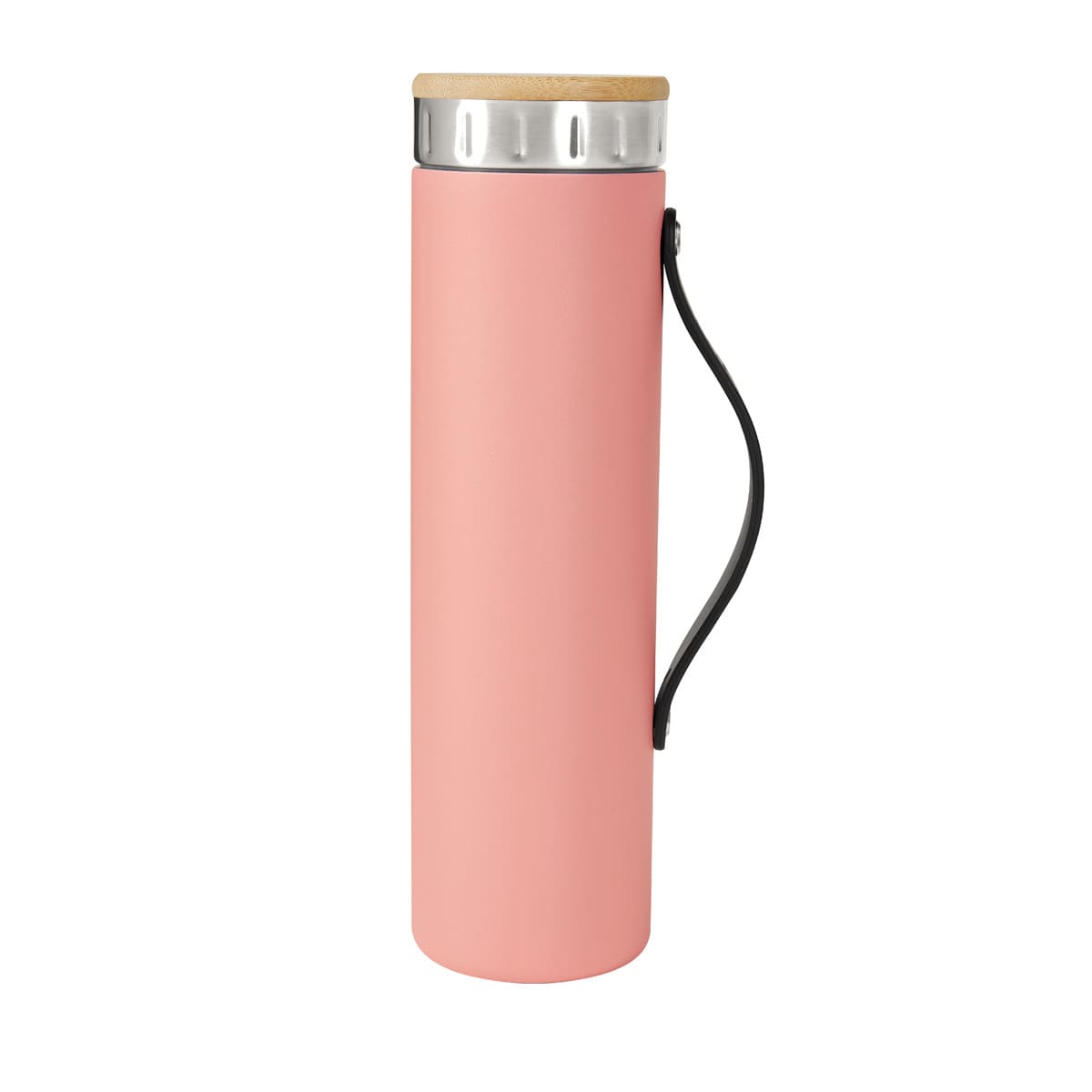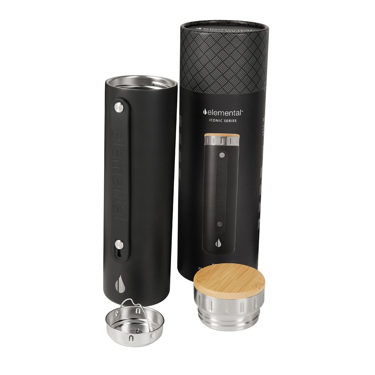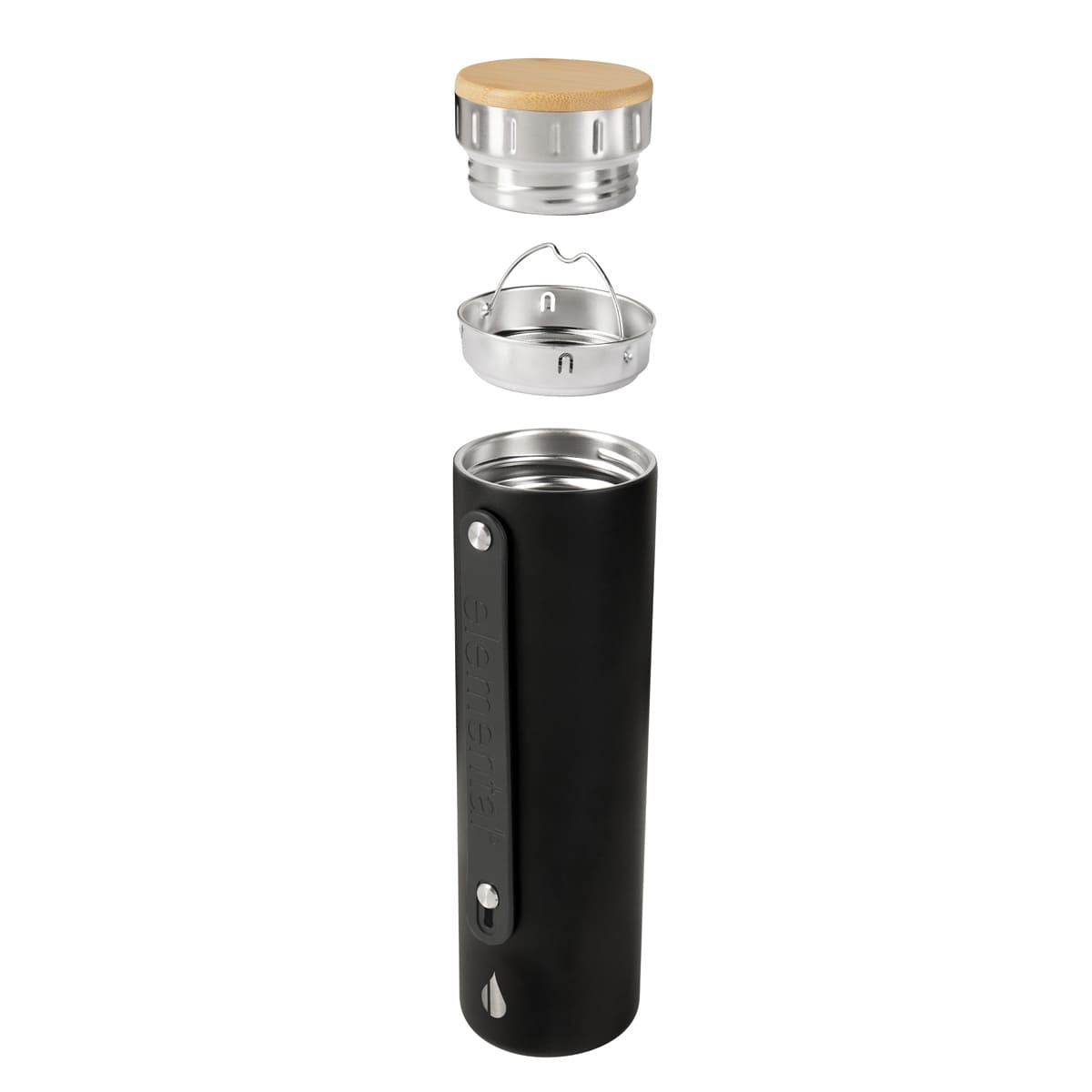 tecnología truebarrier™ que usa aislamiento de triple pared. doble pared de acero inoxidable y una capa de revestimiento de cobre. cerrado al vacío. material bpa free. tapa de bambú. contiene filtro de acero inoxidable. banda de silicón ajustable y removible. terminado rugoso. base antiderrapante. mantiene temperatura caliente 12 hrs y fría 24 hrs aproximadamente. incluye caja individual. el bambú es un producto natural el cual puede presentar variaciones en tonalidades y vetas.