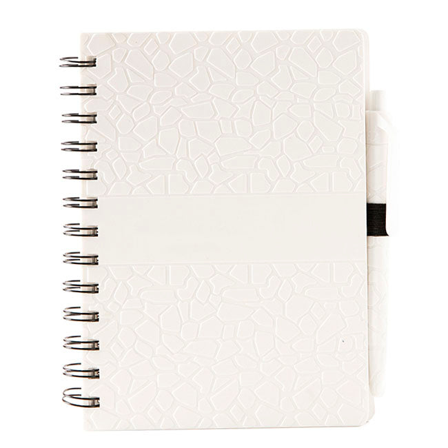 Libreta Troya l Libreta con 70 hojas rayadas. l Carátula con detalle de diseño piedra l Incluye bolígrafo de plástico reciclado. l Colores: Blanco y Negro.