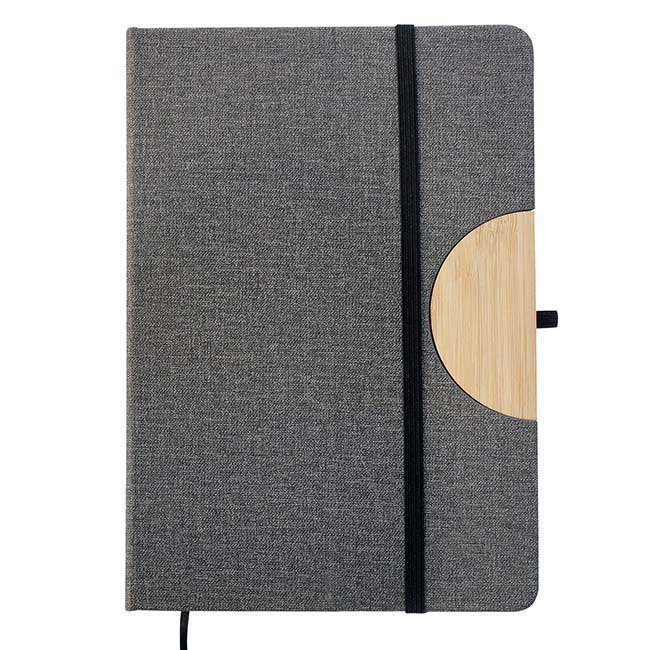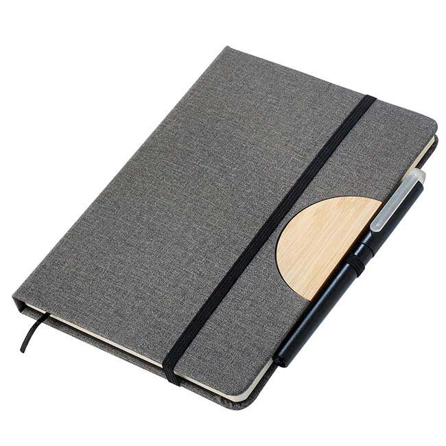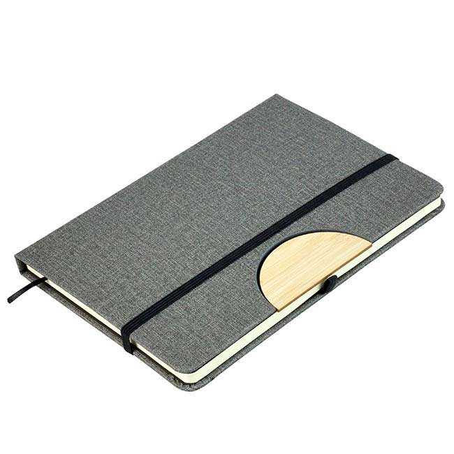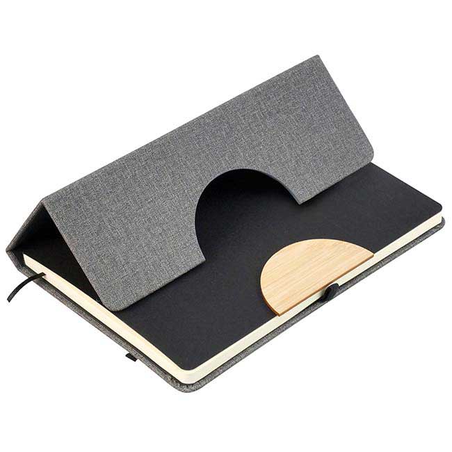 Detalle de bamboo en pestaña de cierre. Sistema para stand móvil y porta bolígrafo. Cinta divisoria. Aprox. 80 hojas rayadas. Color: Gris.