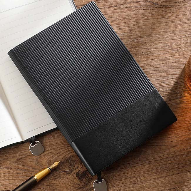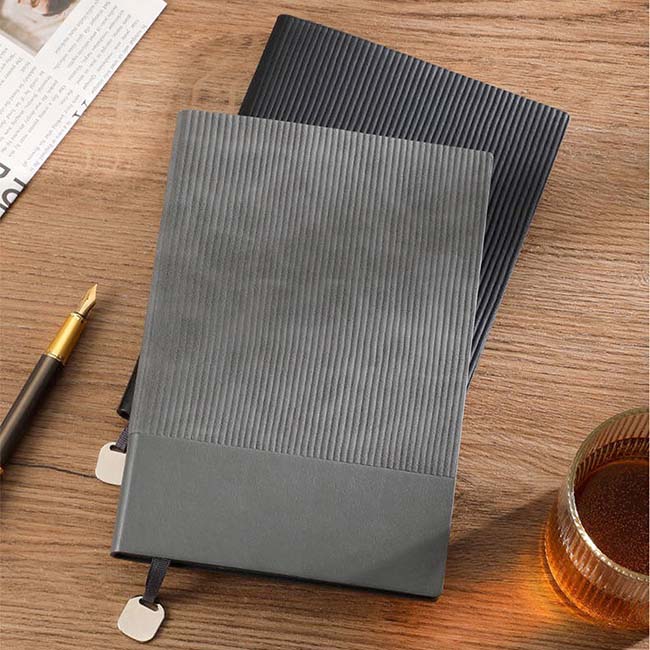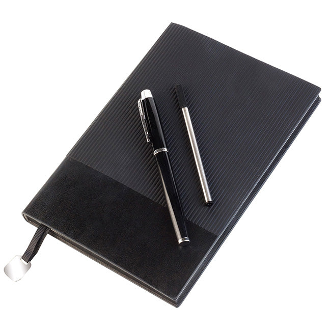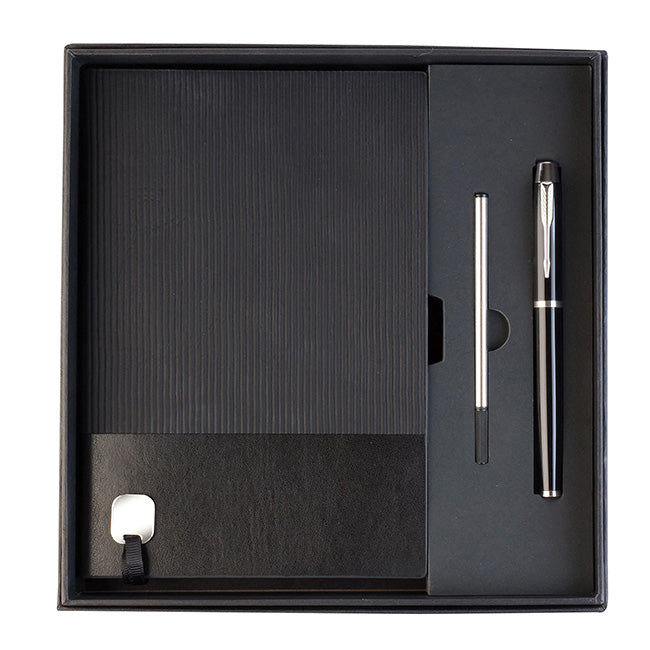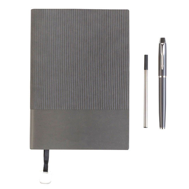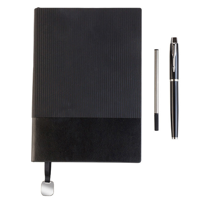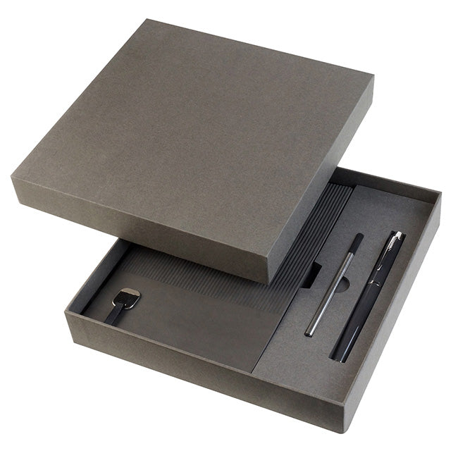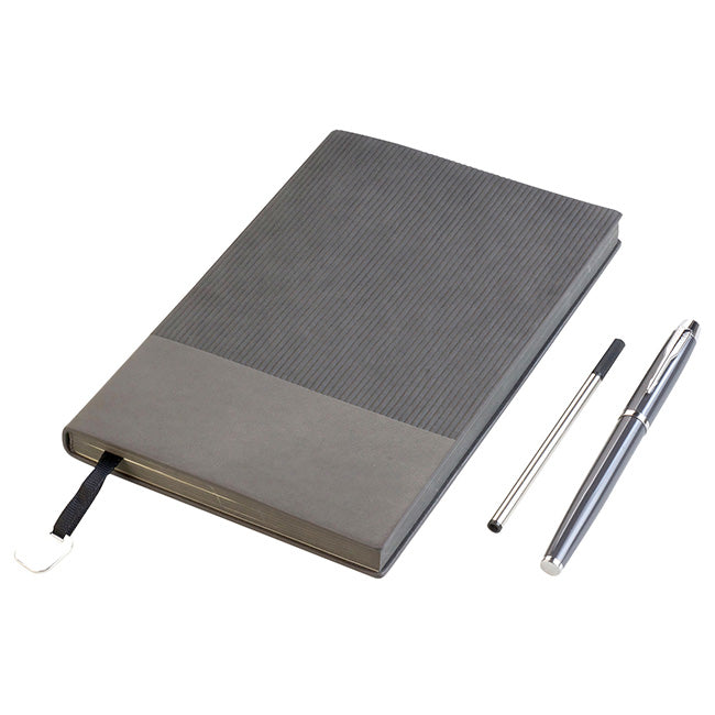 Set Kampala Incluye libreta, bolígrafo y estuche de presentación. l Libreta con 90 hojas rayadas tipo planeador atemporal. l Cinta divisoria con remate de placa metálica. l Funcionales cubiertas flexibles con diseño en líneas. l Colores: Gris y Negro.