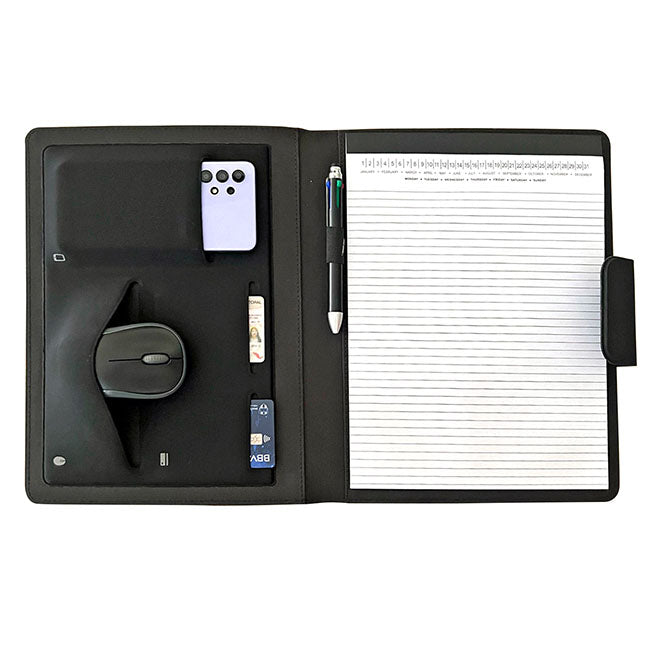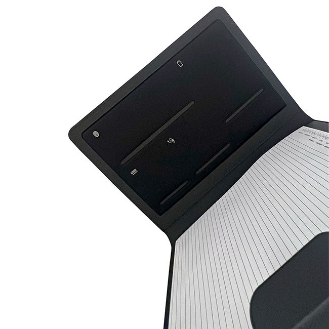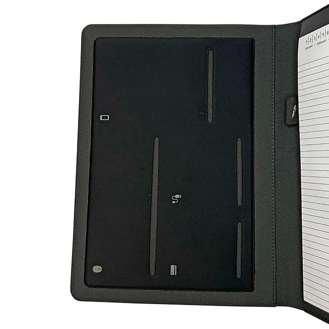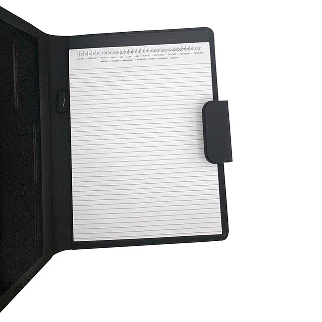 Porta Documentos Ginebra l Incluye block de hojas rayadas. l Interior con portabolígrafos y compartimentos organizadores l Ceja en cierre magnético l Detalle de placa para personalizar.