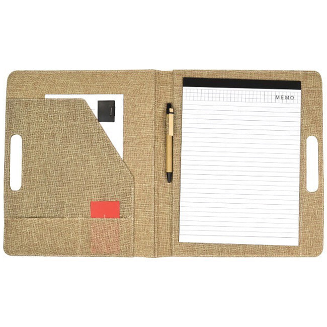 Funciones: Área frontal en Curpiel para personalizar. Incluye Bolígrafo , Block de Notas y Porta-tarjetero.