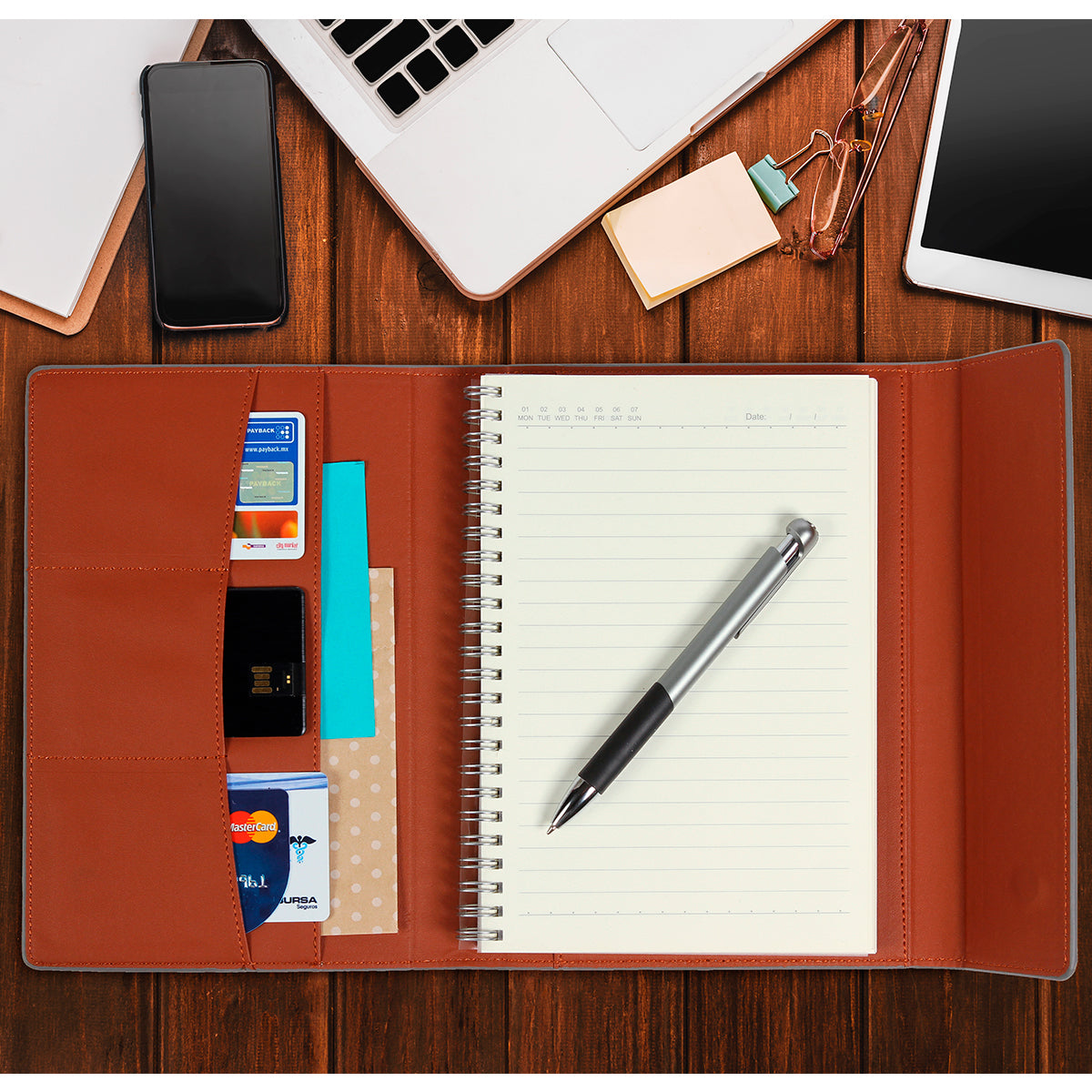 carpeta con un cubierta de tela, que proporciona una apariencia profesional y duradera. cuenta con 80 hojas rayadas y espacios interiores para tarjetas y documentos. estos compartimentos te permiten garantizar que sus documentos estén seguros y protegidos. además, está equipada con un sistema de cierre con imán. este sistema de cierre magnético asegura que la carpeta permanezca cerrada cuando no esté en uso. no incluye pluma.