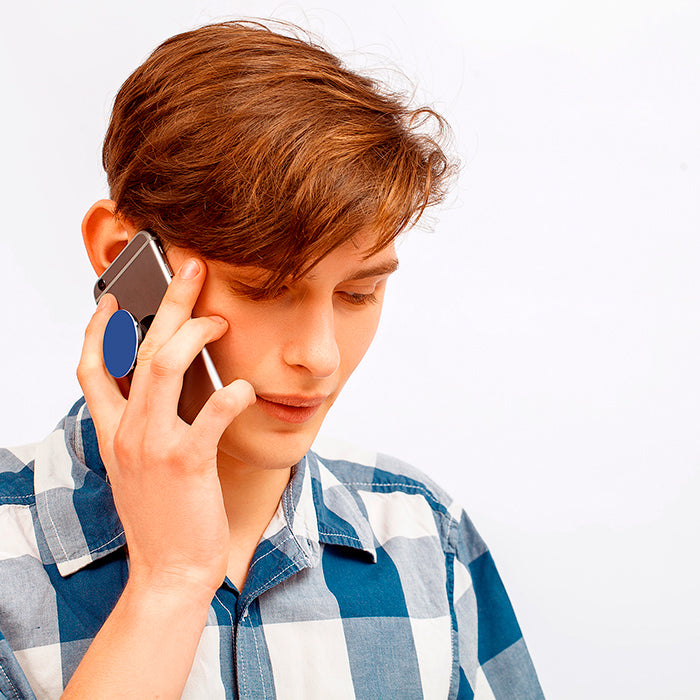 soporte circular de aluminio para smartphone, con adhesivo 3m que funciona también como agarradera de mano.