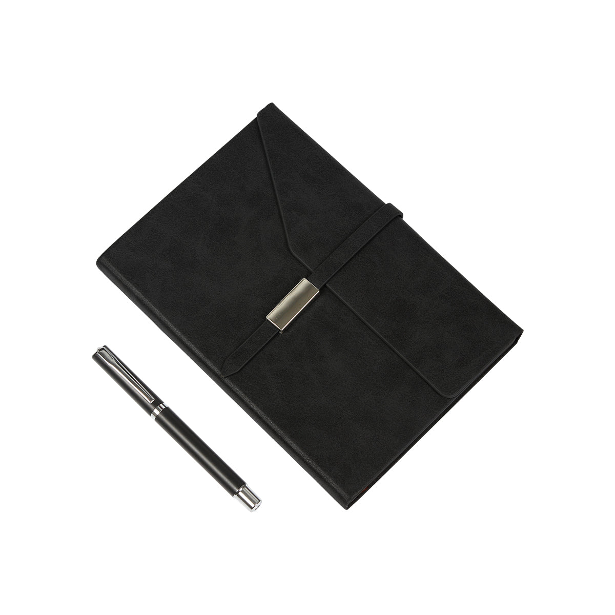 set de libreta de poliuretano (pu) con libreta de 100 hojas rayadas y bolígrafo de plástico con clip metálico a juego. la libreta cuenta con un detalle de metal para cerrarla de manera fácil. esta elegante carpeta está confeccionada en curpiel de alta calidad, lo que le proporciona un aspecto lujoso y sofisticado, además de una durabilidad excepcional, además viene acompañada de una elegante caja de regalo, lo que la convierte en una excelente opción para obsequiar.