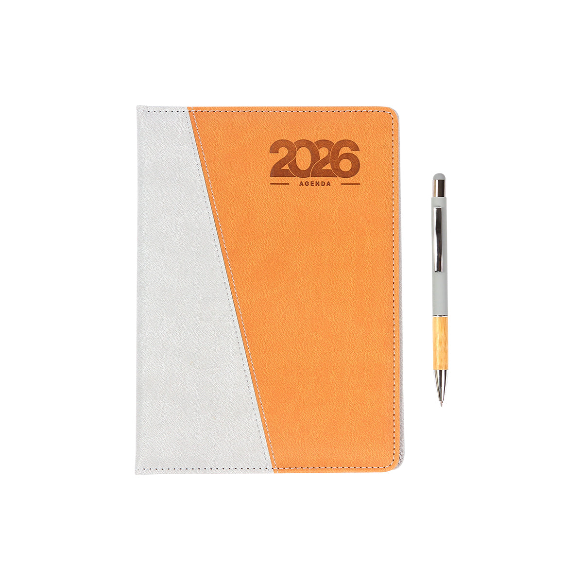set de agenda diaria 2026 bi-tono con pluma y caja de regalo. cubierta bi-tono fabricada en curpiel (pu) e interior de 175 hojas de 65 g. (350 paginas) cada día tiene espacio para tareas importantes y está organizada por horario (5:00 am 22:00 pm). cuenta con: separador de hojas, calendario anual 2025-2027, planeador mensual, hoja de objetivos anuales, hoja de pendientes mensuales, espacio para notas, tareas, sección de contactos y bolsillo interno para almacenar documentos. bolígrafo con detalle de bambú en la parte inferior, clip y punta metálicos y con touch en la parte superior. incluye caja de cartón individual y bolígrafo con tinta de escritura negra.