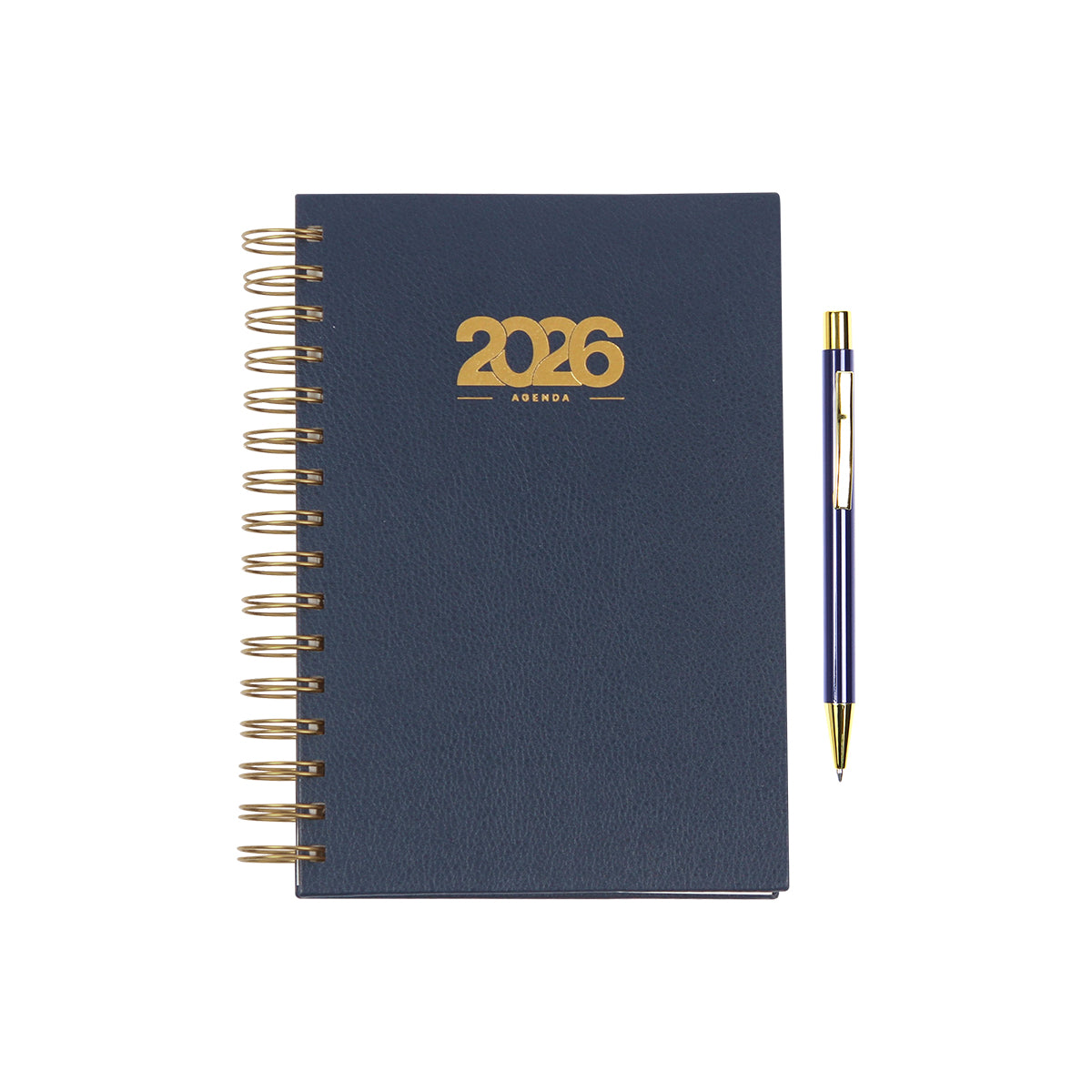 set de agenda diaria 2026 con espiral, detalles en dorado, pluma y caja de regalo. cubierta rígida fabricada en curpiel (pu) y espiral dorada e interior de 175 hojas de 65 g. (350 paginas) cada día tiene espacio para tareas importantes y está organizada por horario (5:00 am -22:00 pm). cuenta con: separador de hojas, calendario anual 2025-2027, planeador mensual, hoja de objetivos anuales, hoja de pendientes mensuales, espacio para notas, tareas, sección de contactos y bolsillo interno para almacenar documentos. incluye caja de cartón individual y bolígrafo con tinta de escritura negra.